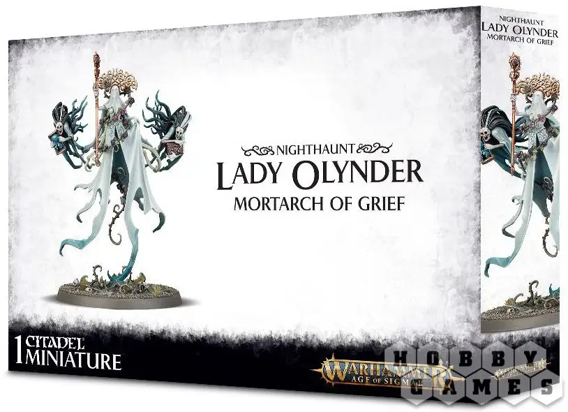 Этот многокомпонентный пластиковый набор содержит детали, необходимые для сборки миниатюры Леди Олиндер, Мортарха Печали (Lady Olynder, Mortarch of Grief). Окруженная аурой абсолютного несчастья и опустошенности, она парит над землей в своем призрачном подвенечном платье и фате, и только очертания черепа проглядывают сквозь ткань. Её свадебный наряд рассыпается на части и спадает позади неё рваными кусками, часть призрачного одеяния служит креплением миниатюры к базе. Тернистые лозы могильных роз произрастают везде, где проплывает призрачная фигура Леди Олиндер, обвиваясь вокруг неё к головному убору, напоминающему терни шиповника. В её правой руке находится Посох Полуночи (Staff of Midnight), резной шест, увенчанный полированным драгоценным камнем из остекленевшего могильного песка. Её сопровождают две жуткие баньши-прислужницы, череполикие призраки со свадебными подарками в руках – песочными часами, дарованными самим Нагашем, которые принесут смерть, если их расколоть, и запечатанной шкатулкой, содержание которой является жуткой и печальной тайной.