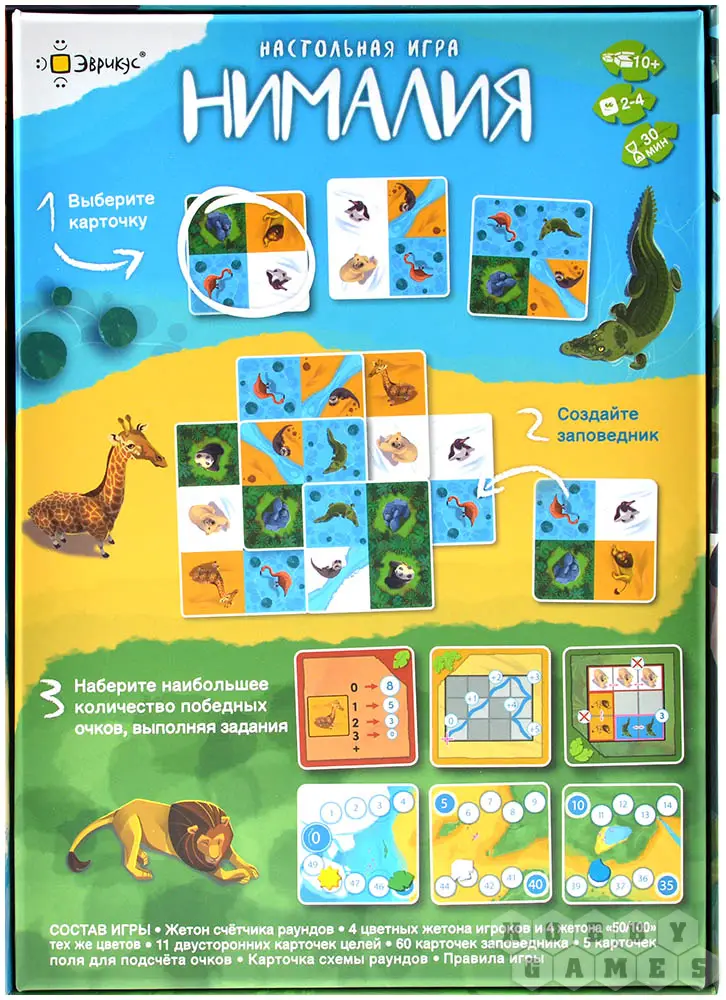 "Нималия" – это настольная игра, в которой перед вами стоит задача создать различные заповедники, где каждый вид животного смог бы жить в гармонии друг с другом. Однако достижение этой цели – занятие весьма непростое, прямо как в жизни. Вам будет необходимо думать наперёд, планируя один, два, а то и три своих следующих шага, чтобы построить заповедник, который самым оптимальным способом будет учитывать потребности каждого животного. Разыгрывая карты с животными, вы должны построить заповедник размером 6x6 карт. Для достижения победы стоит учитывать карты целей, которые будут давать победные очки за самые большие ареалы обитания конкретного животного, или за соседство друг с другом определённых видов животных.