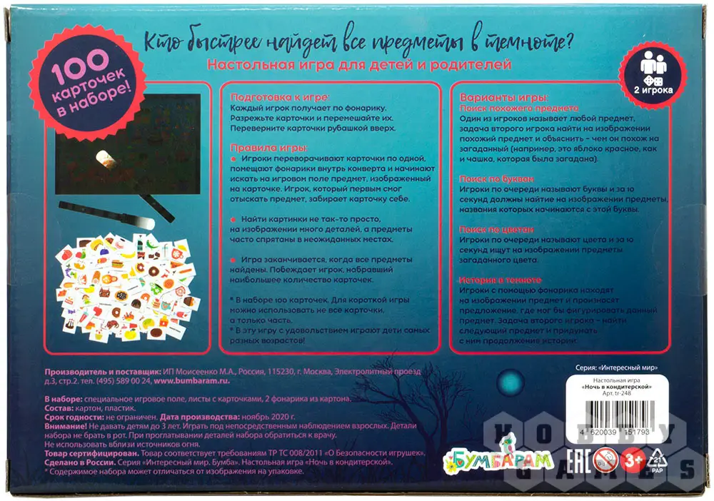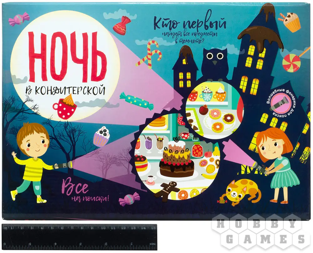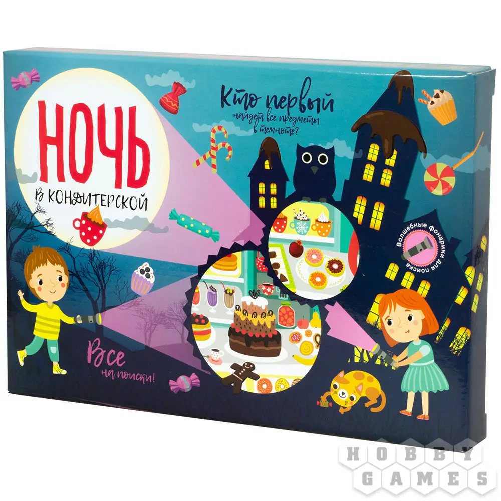 "Ночь в кондитерской" – это весёлая игра, которая понравится детям любых возрастов. Основная задача – найти предметы при помощи фонарика. Перед началом игры случайным образом перемешайте 100 карточек с изображениями и оставьте количество, которое хотите использовать. Тот, кто находит предмет на игровом поле, забирает себе карту.