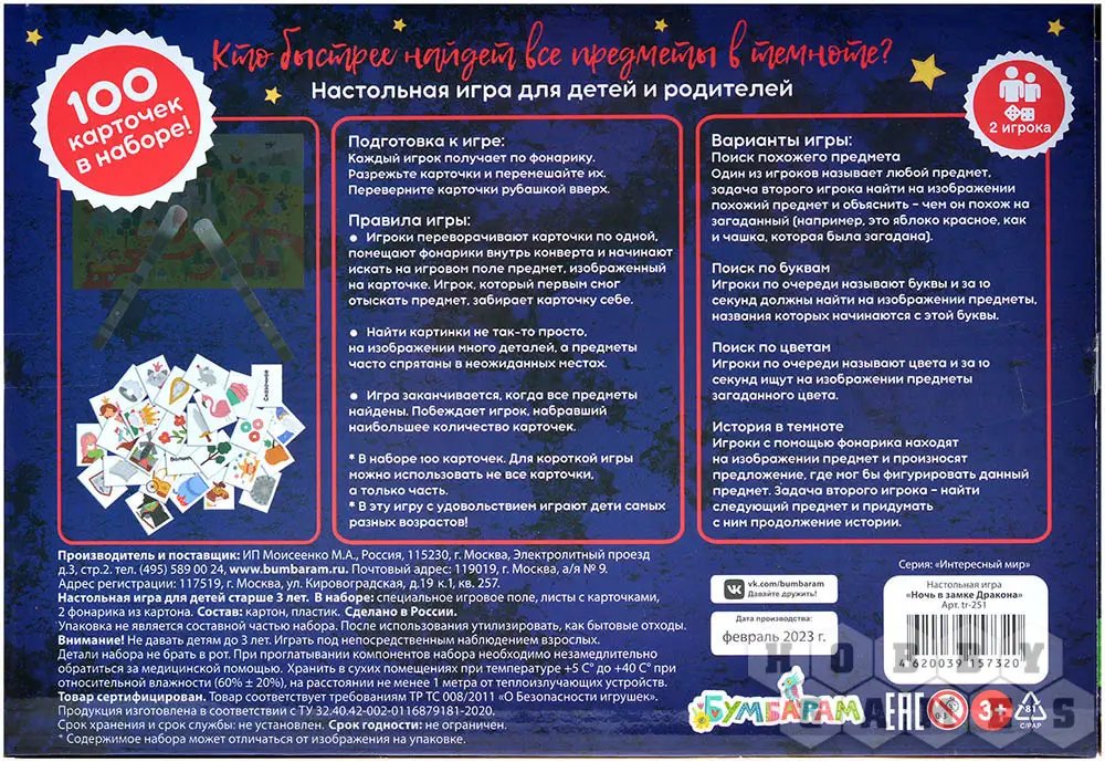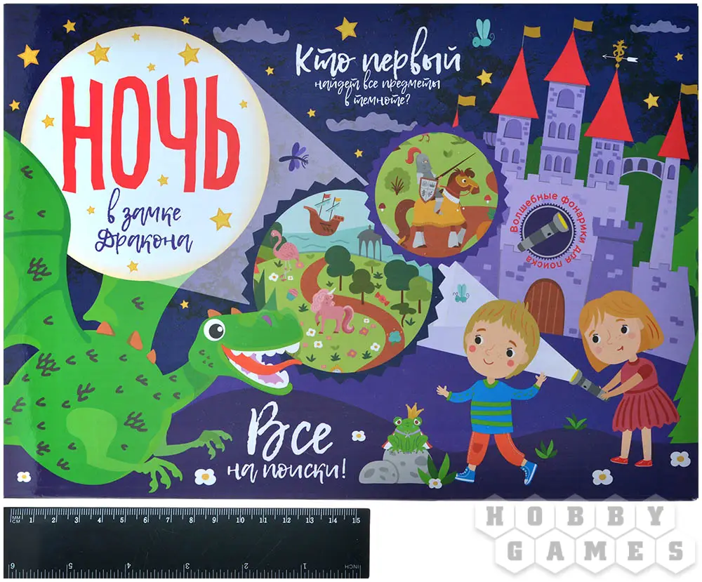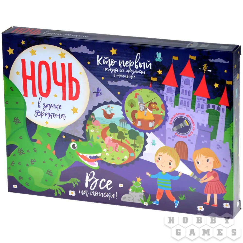 "Ночь в замке Дракона" – это весёлая игра, которая понравится детям любых возрастов. Основная задача – найти предметы при помощи фонарика. Перед началом игры случайным образом перемешайте 100 карточек с изображениями и оставьте количество, которое хотите использовать. Тот, кто находит предмет на игровом поле, забирает себе карту.