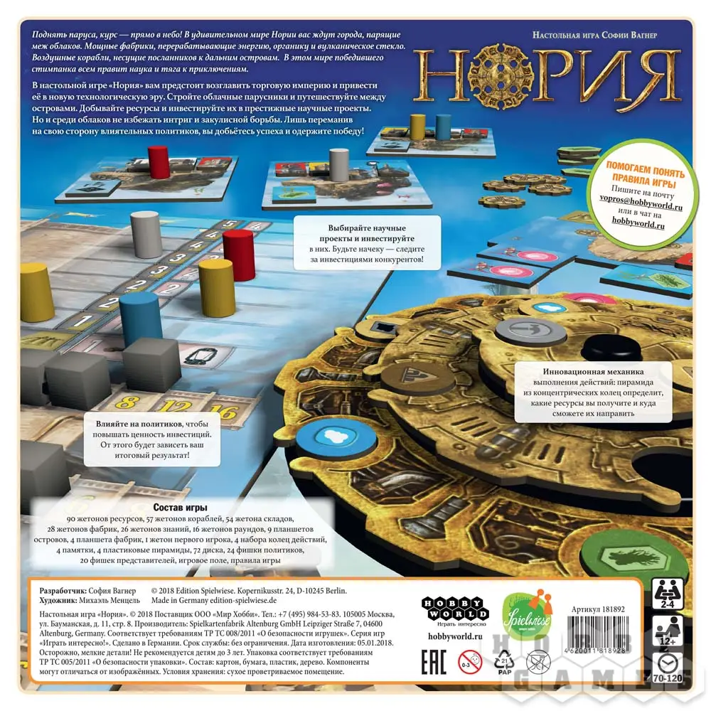 "Нория" — удивительная экономическая градостроительная игра в сеттинге стимпанка! Здесь города парят среди облаков, а знания правят балом! За них, а также за различные товары вам и предстоит бороться. Стройте мощные заводы по переработке ресурсов, исследуйте острова и любуйтесь видами, но главное — внесите наибольший вклад в великие проекты, чтобы победить! Да, все мы будем работать на общее благо, но победитель будет лишь один — тот, кто сделал больше всех для процветания народа.