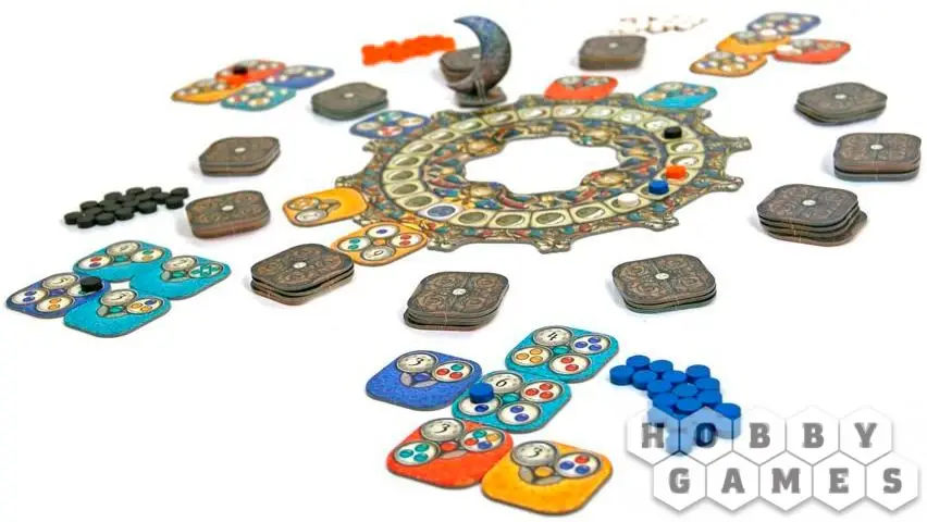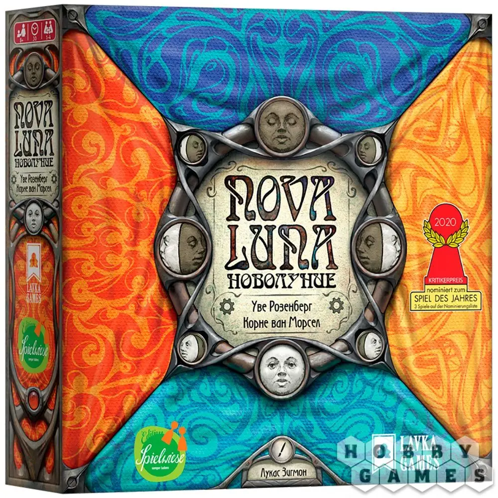 "Новолуние" – красочная абстрактная игра, в которую можно играть как одному, так и в компании. В игре есть игровое поле в виде лунного колеса, жетоны с заданиями и деревянные диски. Жетоны и диски в игре четырёх цветов: жёлтого, синего, красного и бирюзового. На жетонах изображены задания и цифры. Цифры – количество сегментов на колесе, на которое вы должны передвинуть диск своего цвета. Когда вы выполняете задания на жетонах, на них вы также располагаете диски из своего запаса. Чтобы выполнить задания, нужно располагать жетоны по соседству в соответствии с цветами, указанными в заданиях. Тот, кто первым выложит последний диск из своего запаса на жетон – побеждает.