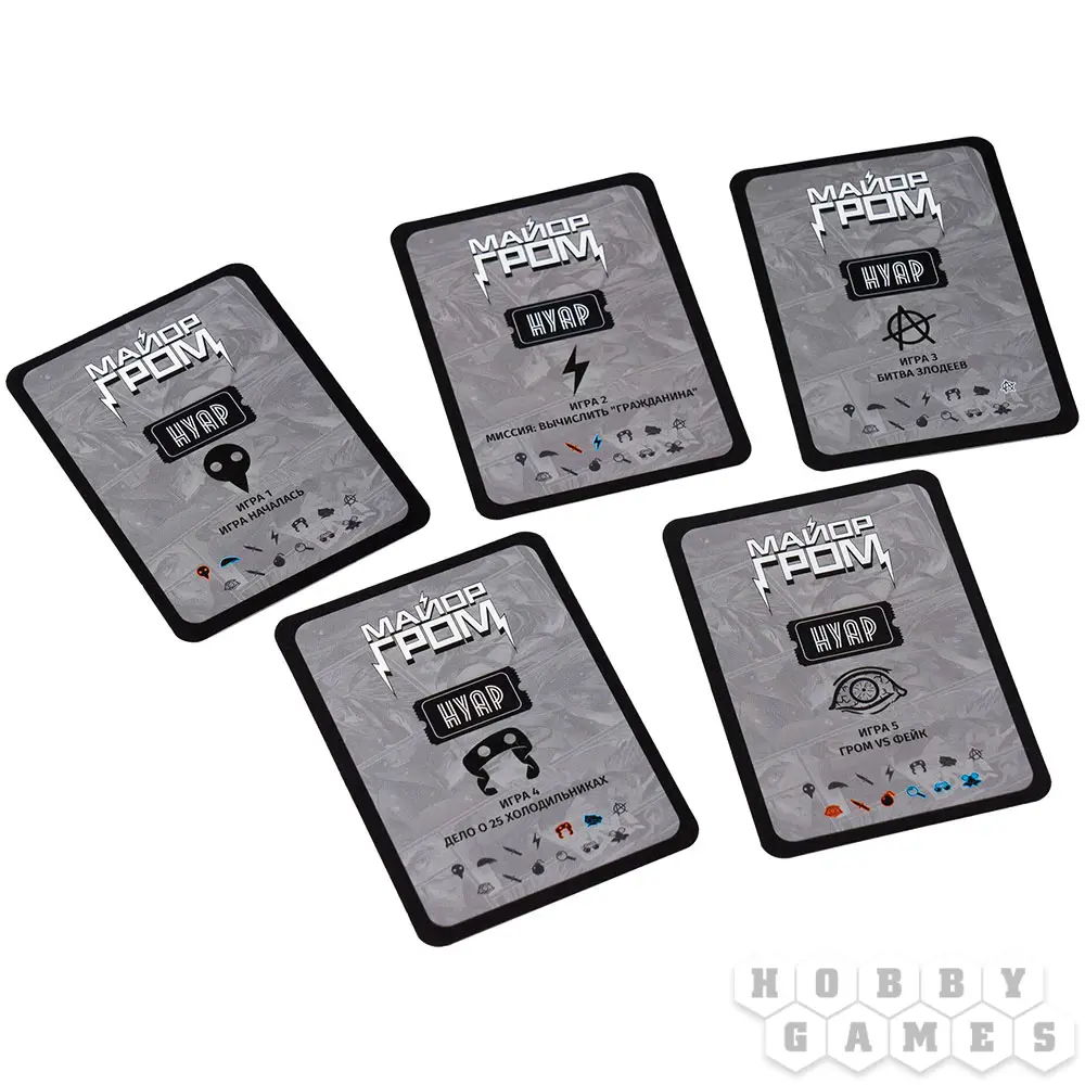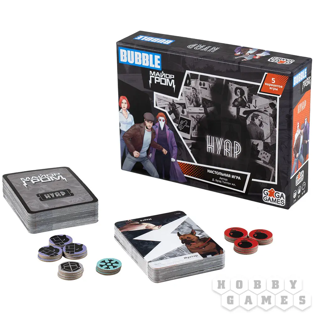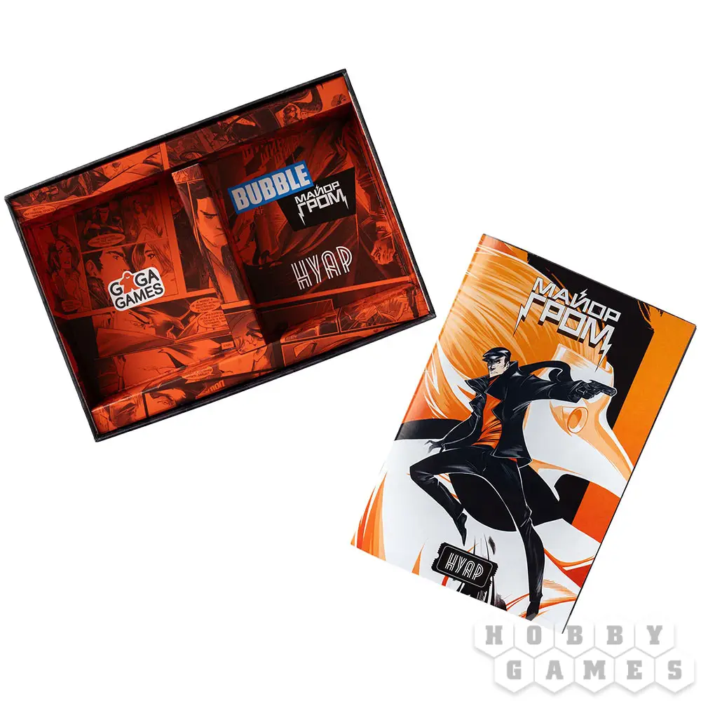 "Нуар: Майор Гром" – это несколько отдельных детективных игр, для которых используется единая колода и определенные жетоны. Целых пять разных сюжетов доступны для прохождения. Начните с принципиальной мозговой дуэли один на один и продолжайте, собрав команду единомышленников. Просчитывайте наперёд возможные действия оппонентов и покажите всем, кто есть кто. Пусть победит умнейший и провозгласит себя главным действующим лицом в жизни суетливого мегаполиса!