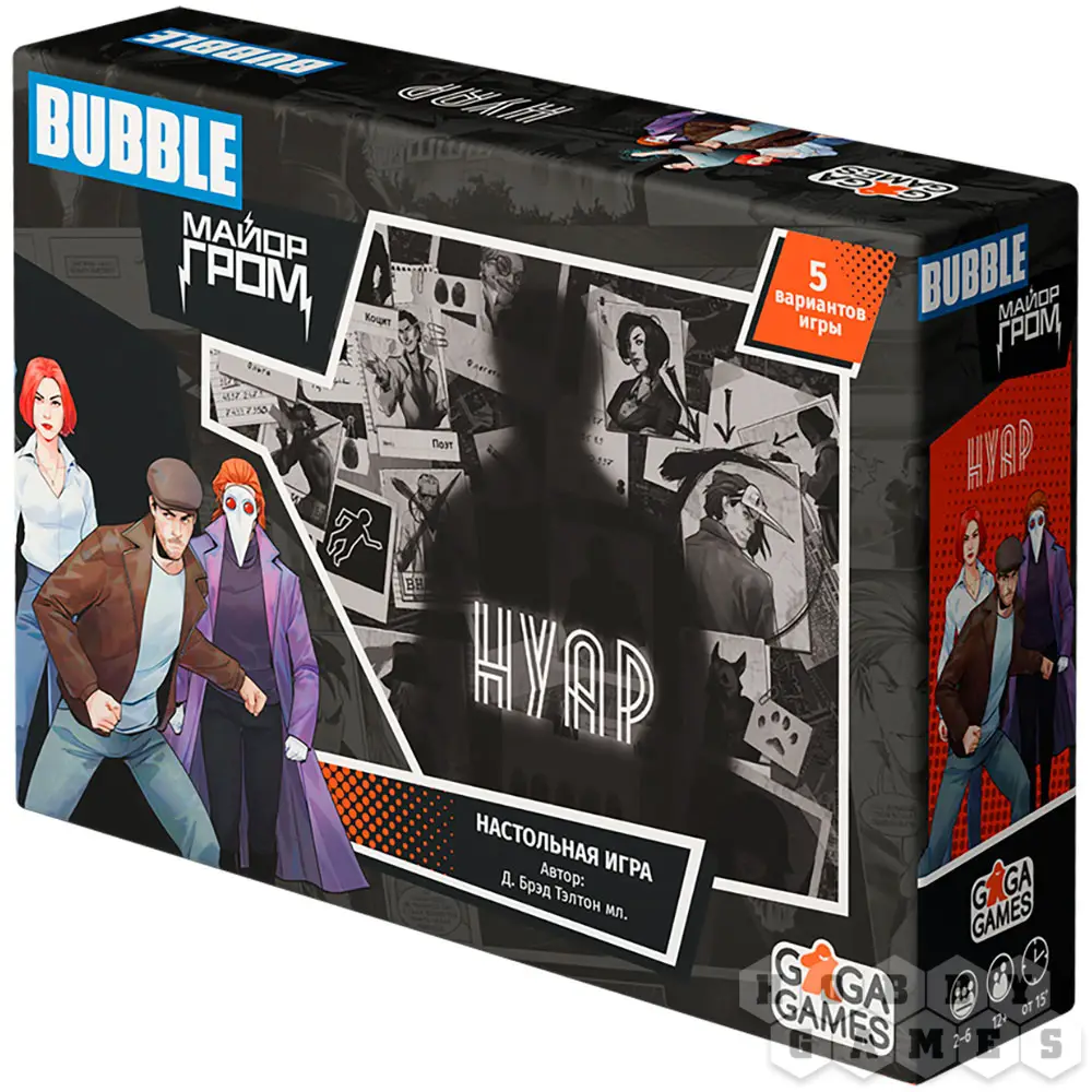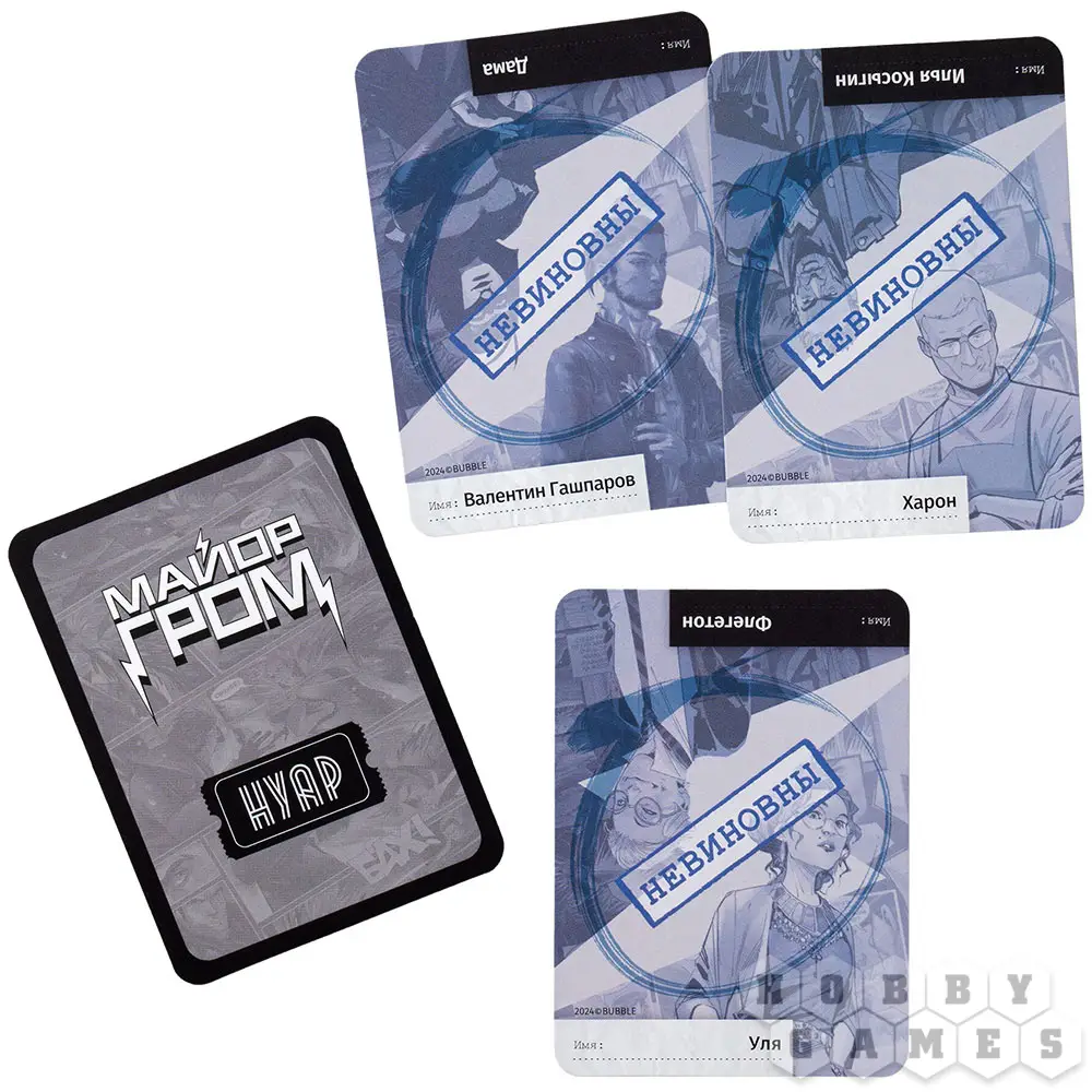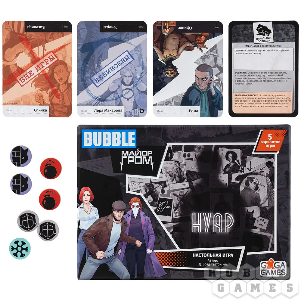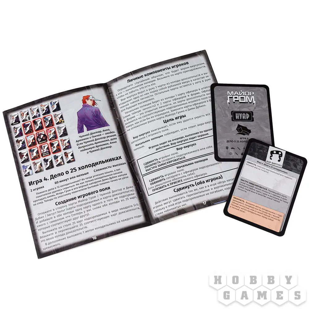 "Нуар: Майор Гром" – это несколько отдельных детективных игр, для которых используется единая колода и определенные жетоны. Целых пять разных сюжетов доступны для прохождения. Начните с принципиальной мозговой дуэли один на один и продолжайте, собрав команду единомышленников. Просчитывайте наперёд возможные действия оппонентов и покажите всем, кто есть кто. Пусть победит умнейший и провозгласит себя главным действующим лицом в жизни суетливого мегаполиса!