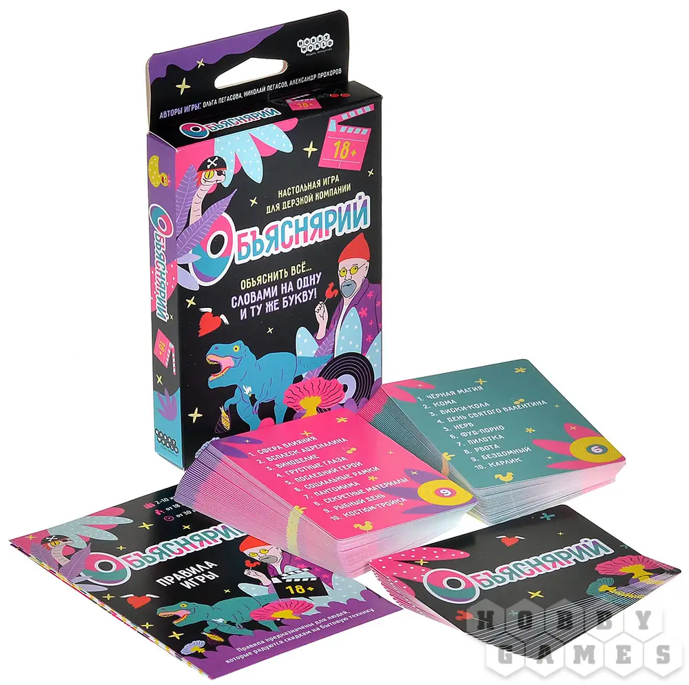 "Объяснярий 18+" – это пикантная карточная игра, которая заставит ваш мозг выложиться не на 100, а на все 200 процентов! Задача игроков предельно проста – всего лишь объяснять слова другими словами. Вот только делать это придётся не абы как: словарь игроков будет ограничен до одной единственной буквы. С этой игрой вы точно освежите и пополните ваш словарный запас.