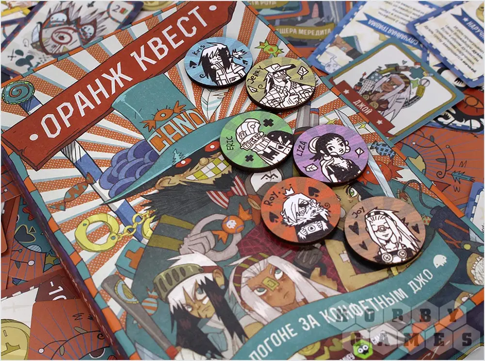 В первом тираже были цветные пластиковые монетки. Во втором уже деревянные и не цветные. Сюрприз! В третьем тираже будут деревянные и цветные! Печать на монетках гораздо более стойкая, чем у пластиковых, поэтому монетки выдержат множество бросков и при этом сохранят первоначальный вид. Рой и Лиза впервые доступны в цвете, а у Эрика новый более сочный цвет.