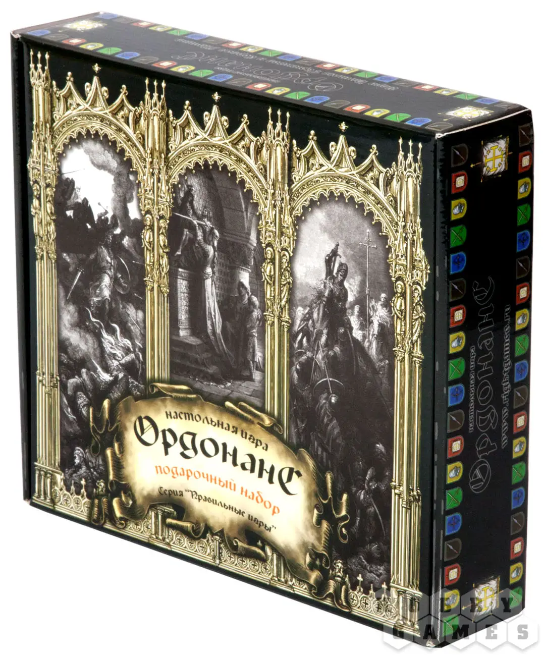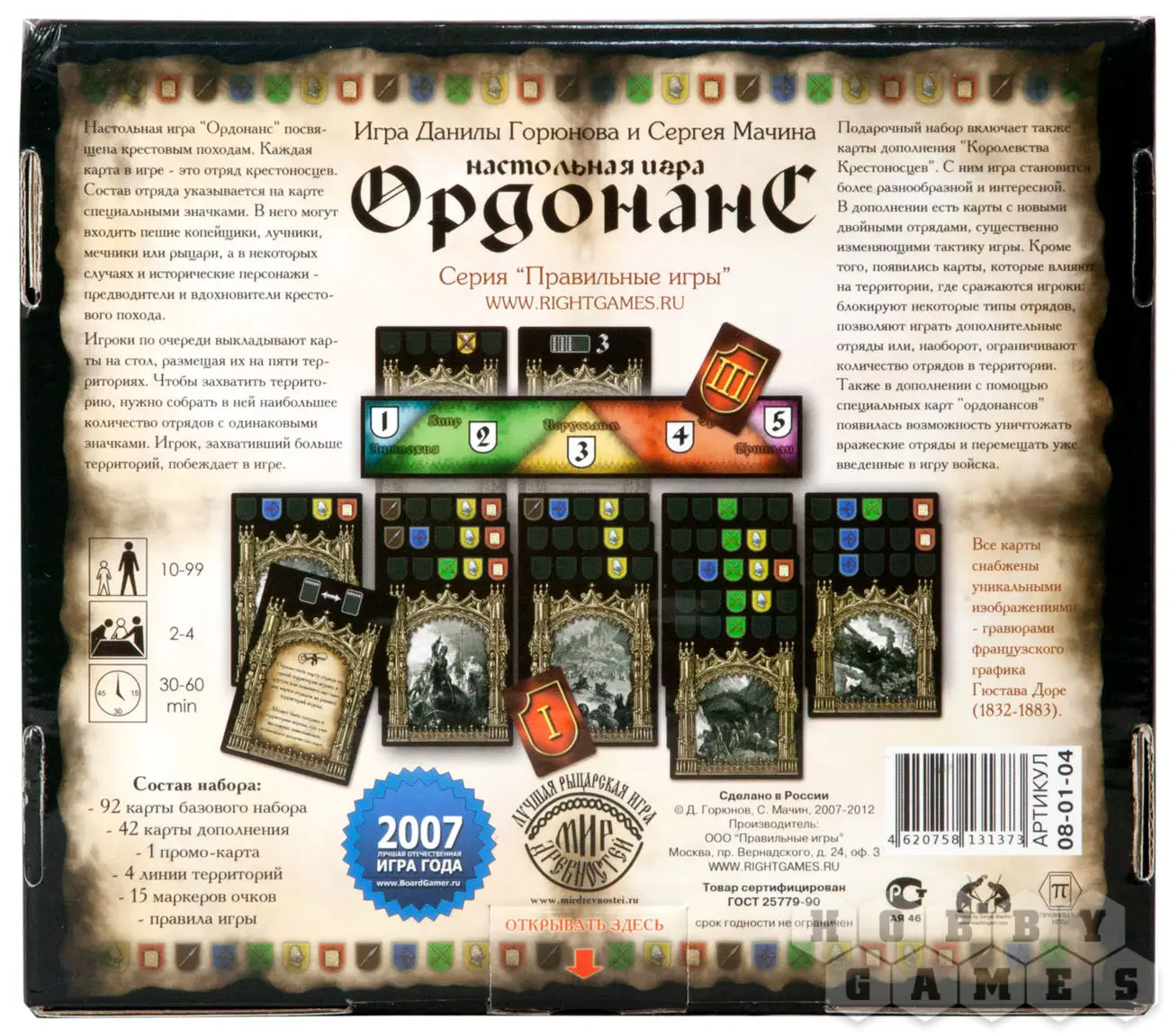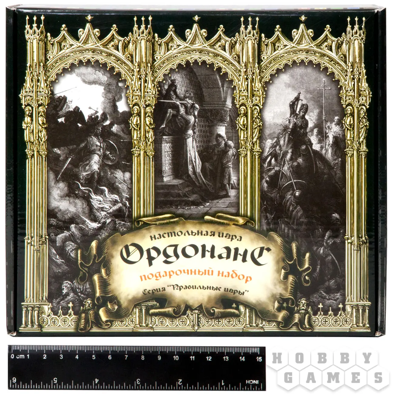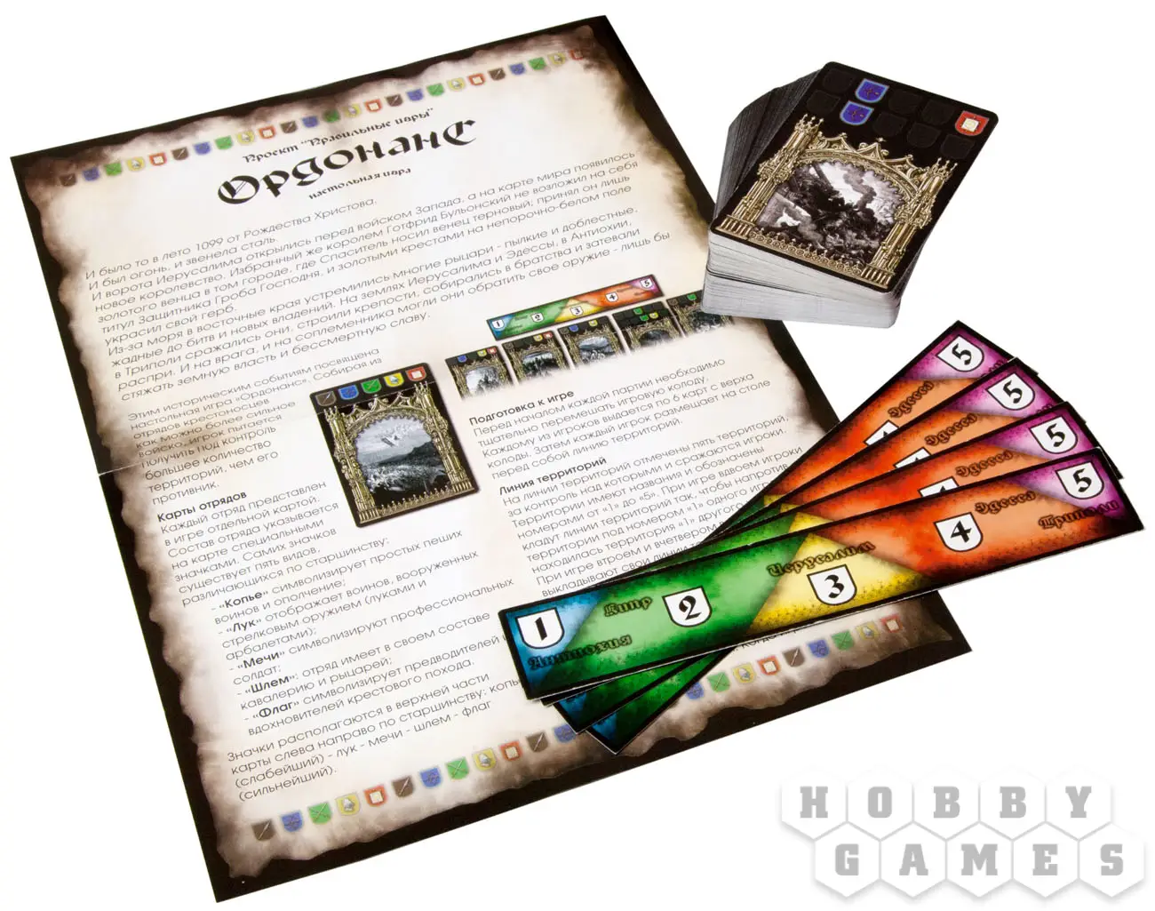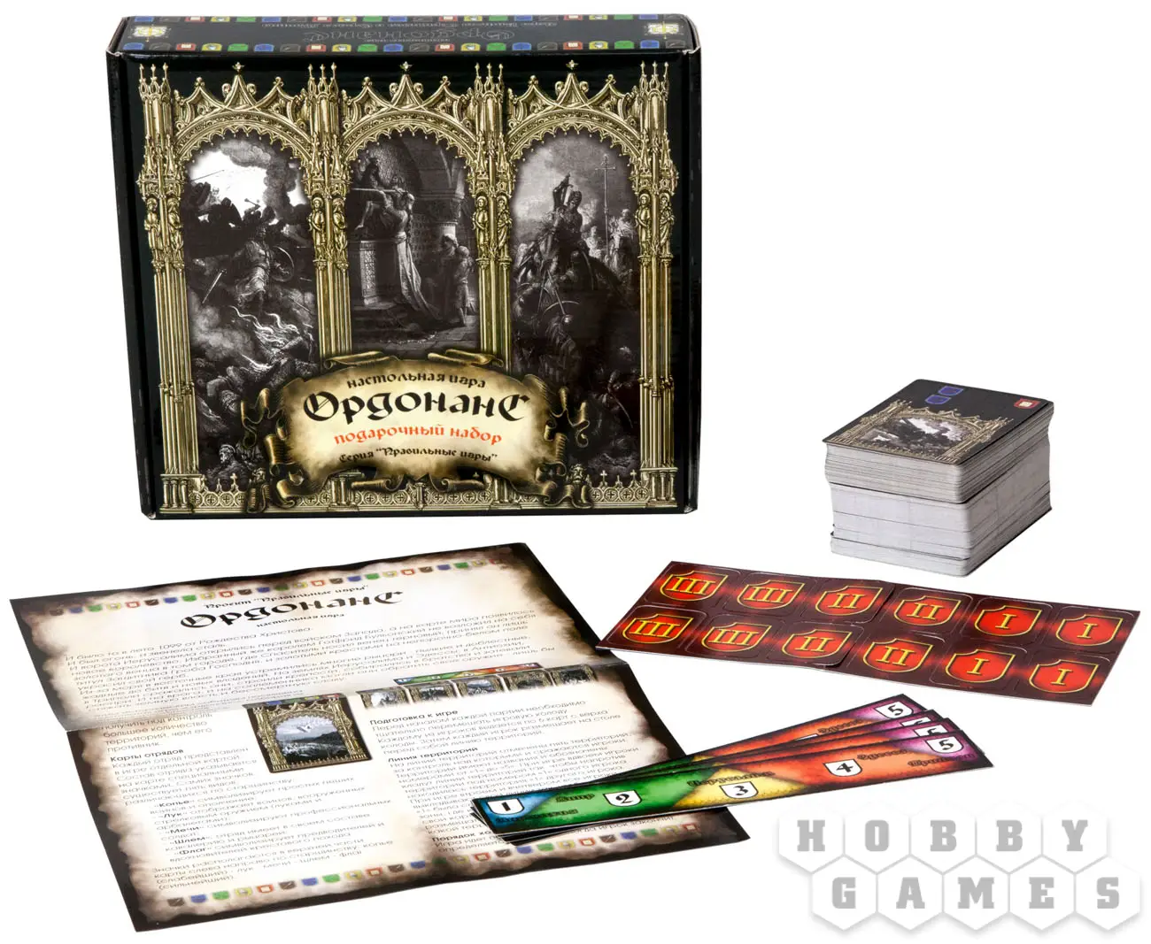 Настольная игра «Ордонанс. Подарочный набор» — это карточная игра для 2-4 игроков. Она перенесёт вас во времена крестовых походов; её дизайн выполнен по гравюрам французского графика Гюстава Доре, которые использовались в качестве иллюстраций к сочинению 19 века «История крестовых походов». В коробке вы найдёте базовую колоду «Ордонанс», а также дополнение «Королевство крестоносцев». Сможете ли вы, проявив всю свою мужественность, отвагу и проворность, выжить в этих суровых временах?