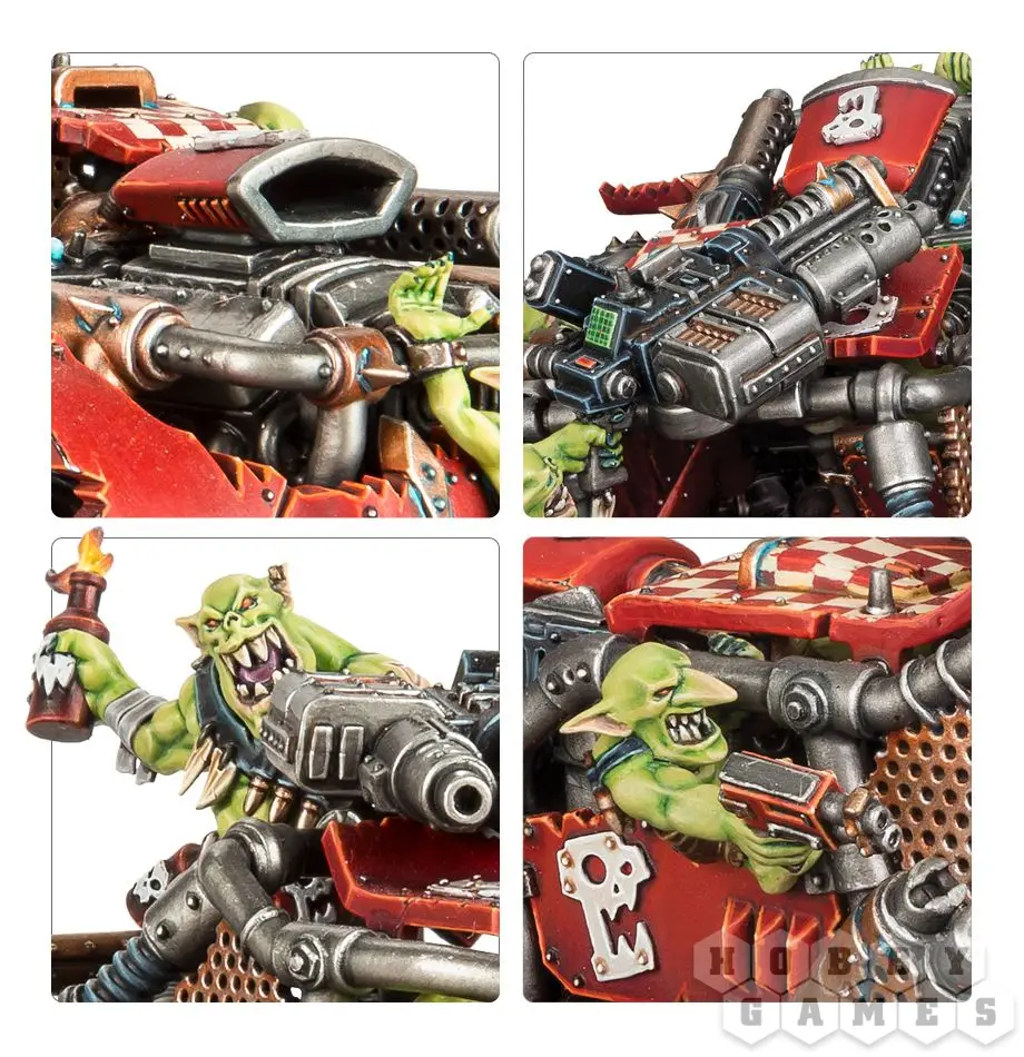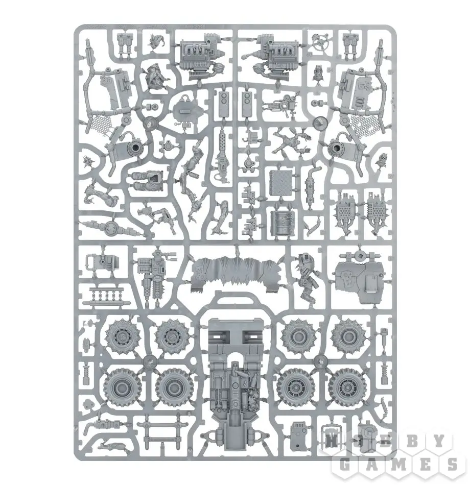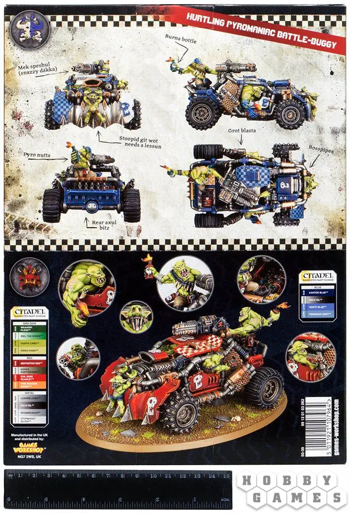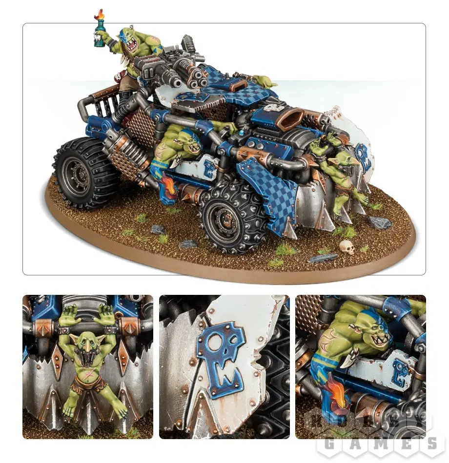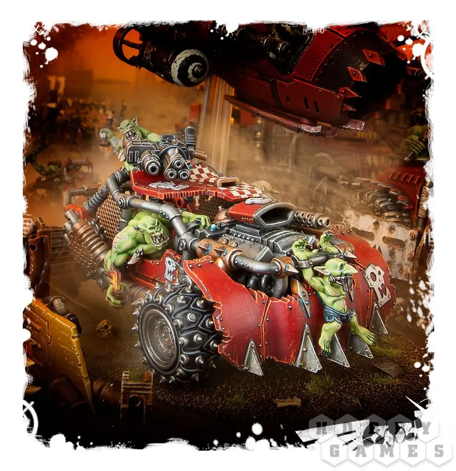 Здесь Вы найдёте все необходимые пластиковые детали для сбора бумдаккового рыдвана. Эта машина сделана в расчёте на максимальную скорость, отчего орки не стали прибивать гвоздями металлические пластины ко всем частям рыдвана. Вы даже можете собрать его без крыши, с одной лишь открытой "клеткой" безопасности. На каркасе закреплена куча выхлопных труб и воздухозаборников, подсоединённых к находящемуся впереди машины огромному мощному двигателю. Там же можно увидеть широкий бульдозерный отвал, к которому прочно привязан грот в маске. Если Вы ещё не поняли, что водители – психи, то обратите внимание на особую кнопку, поставленную меком слева от главного воздухозаборника. Справа из машины высовывается водитель, зловеще ухмыляющийся и держащий в руках горящую бутылку, а сидящий рядом с ним грот размахивает хлапухой. Сзади бросает ещё одну бутылку орущий от радости поджигатель, не падающий из машины лишь потому, что вцепился в рукоятку большого стреляла.