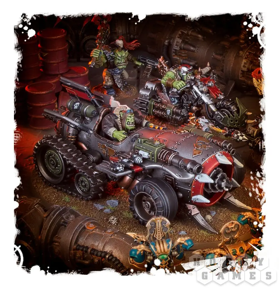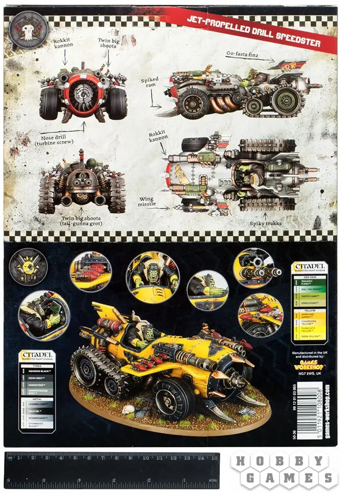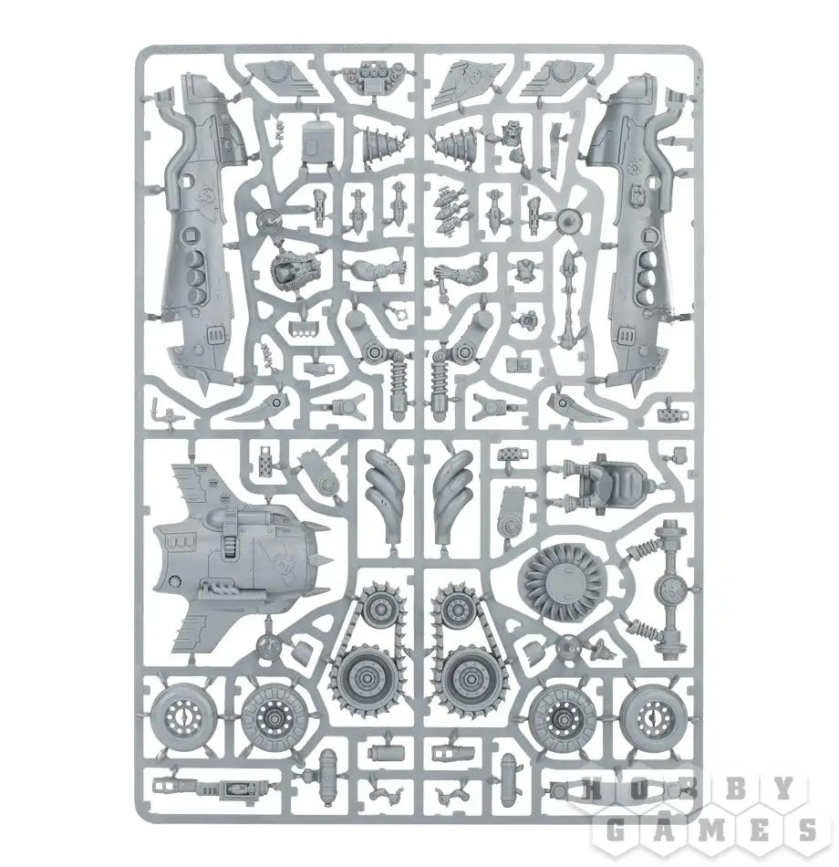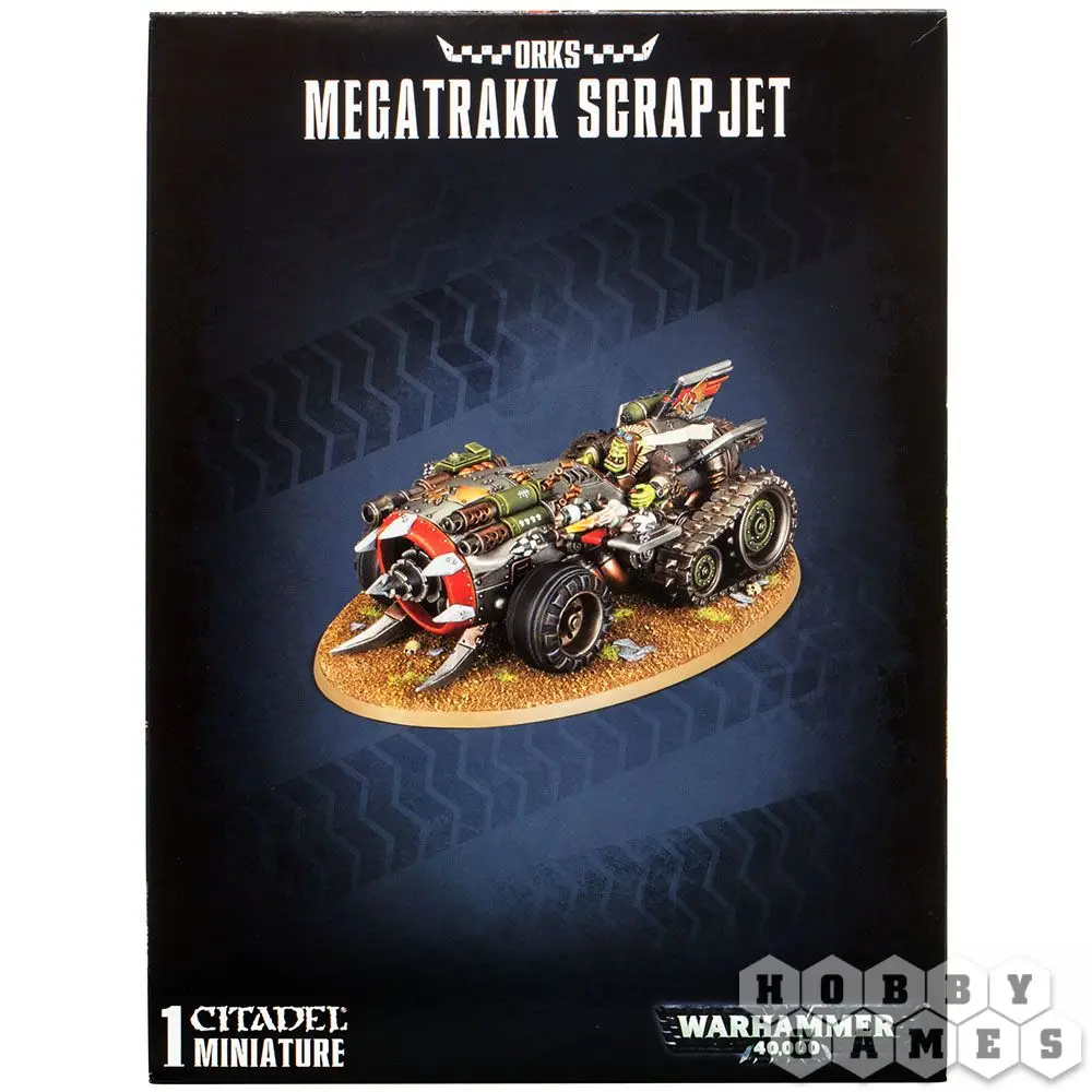 Здесь Вы найдёте все необходимые пластиковые детали для сбора мегагусеничного ракетомобиля (Megatrakk Scrapjets). Созданная вокруг фюзеляжа сбитого орочьего самолёта тачка является по сути металлической трубой, обвешанной всевозможными штуками для убийства врагов. На носу приделана пушка с ленточной подачей снарядов, ракеты, которые можно установить как будто после запуска, на турбине закреплён бур с таранными шипами, одно сдвоенное большое стреляло прибито спереди, а другое сзади, чтоб и хвостовому стрелку-гроту было чем заняться. Крылья оторвались во время чудовищной случайности, оставившей орка без самолёта, но на корпусе всё ещё есть стабилизаторы и элероны, ведь это круто, а в крутости суть того, почему стоит быть летуном! Сам пилот одет в лётную куртку, защитные очки и развевающийся за спиной длинный шарф, а сидит орк в кабине, полной инструментов, про которые он, конечно, забыл. Закреплённое сзади ракетомобиля выхлопное сопло придаёт ускорения его гусеничным колёсам.