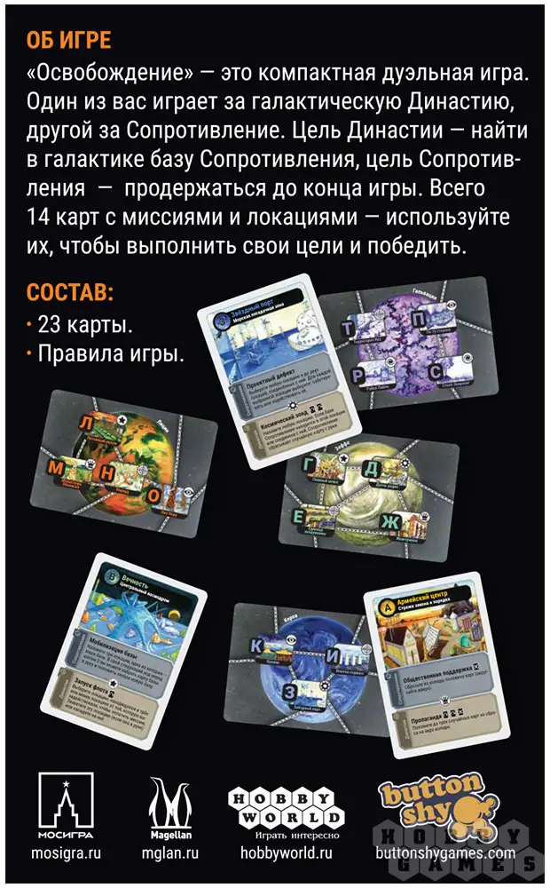 "Освобождение" – это невероятно компактная карточная игра, которая позволяет двум игрокам разыграть галактическое восстание и его подавление, используя колоду всего из 18 карт (а с дополнением, которое лежит в коробке, из 23).