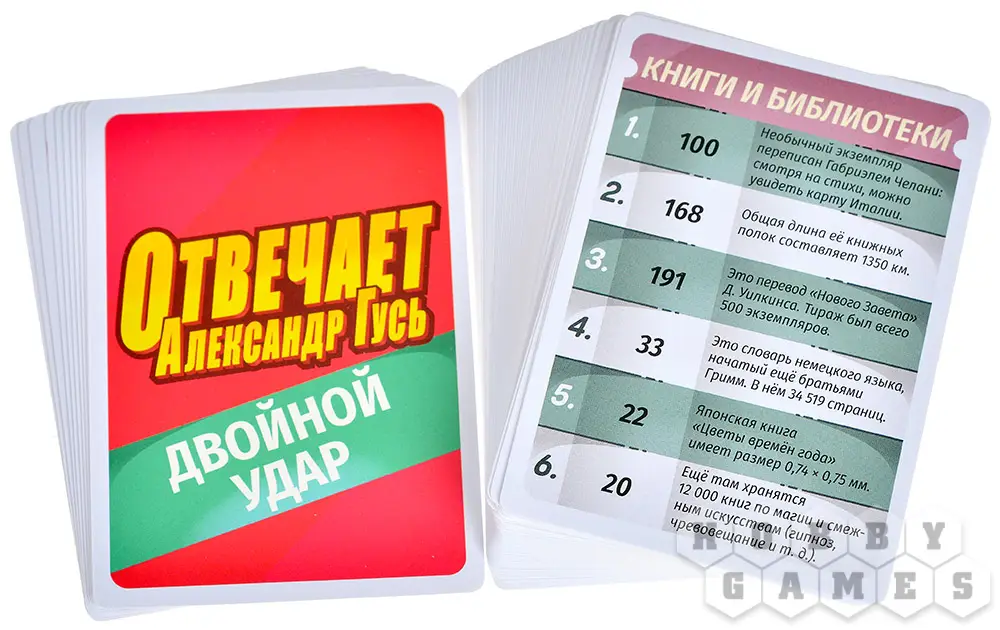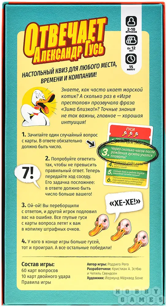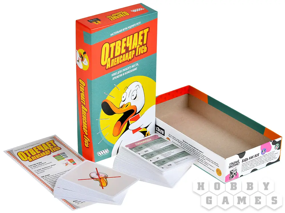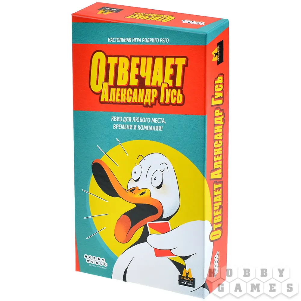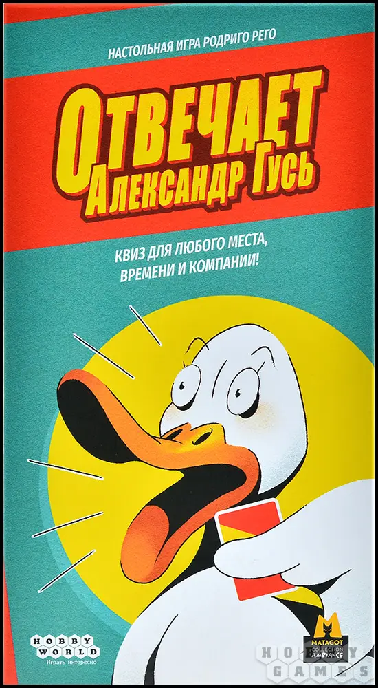 "Отвечает Александр Гусь" – это весёлая игра для большой компании. Игрокам предстоит угадать правильный ответ на заковыристый вопрос, ну, или, по крайней мере, попытаться максимально приблизиться к нему. В то же время придётся следить за ответами остальных участников и в нужный момент проверить их.