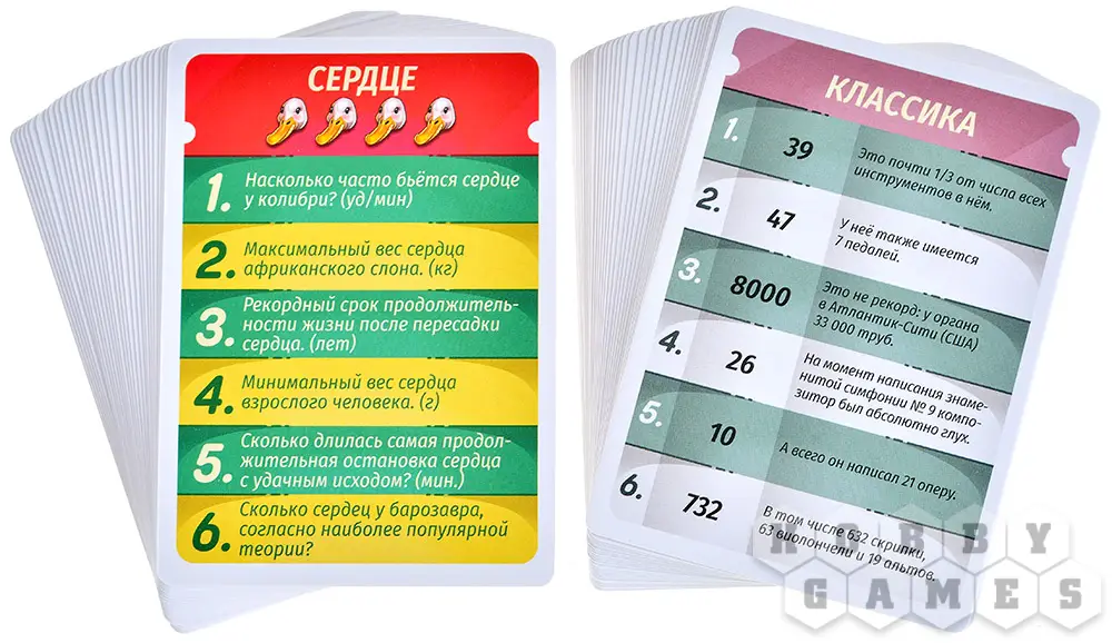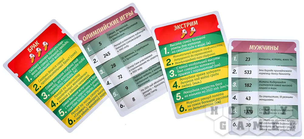Правила здесь очень просты: один из участников берёт карту (которые, кстати, разделены по темам) из колоды и зачитывает один из вопросов. Ответом на такой вопрос будет число, в этом и есть основная фишка игрового процесса. Итак, первый игрок пытается ответить, но таким образом, чтобы его число не превышало правильный ответ. Следующему игроку будет немного сложнее, ведь он должен ответить числом, которое будет больше предыдущего. И так ход передаётся до тех пор, пока один из игроков не захочет проверить отвечающего: а не перегнул ли он палку, назвав число больше правильного ответа? Если это действительно так, то тот, кого подловили на ответе, получает штрафные очки с карты вопросов.