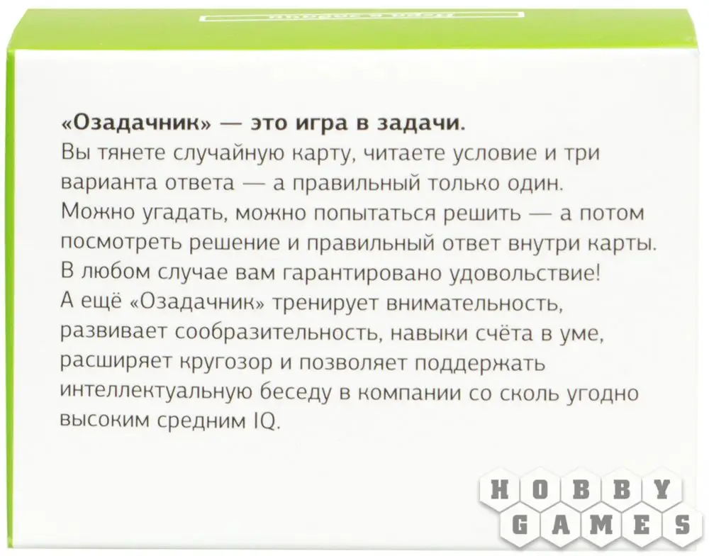 Любите разминать мозги? Тогда вы выбрали правильную игру-викторину! Сложные вопросы с трудными задачами являются визитной карточкой "Озадачника". Принципы любой из игр этой серии просты – тяните карту и читайте вопрос. На обратной стороне карточки есть три варианта ответа, а ответ на вопрос находится внутри карточки. Если хотите ещё больше усложнить задачку, то постарайтесь ответить не глядя в варианты ответов.