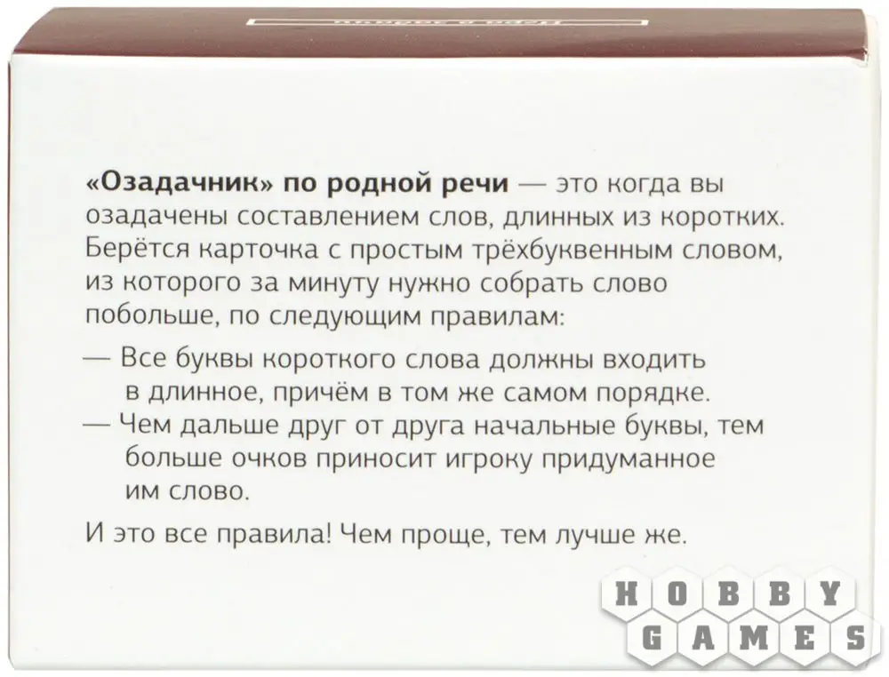 "Озадачник. Родная речь" отличается от других игр серии, так как в нём нет вариантов ответа, зато свобода творчества сильно выше. Чтобы заработать очки, придётся составлять длинные слова из букв коротких слов, написанных на карточке. Если хотите задание посложнее, то старайтесь придумывать слова так, чтобы между начальными буквами было как можно больше новых букв.