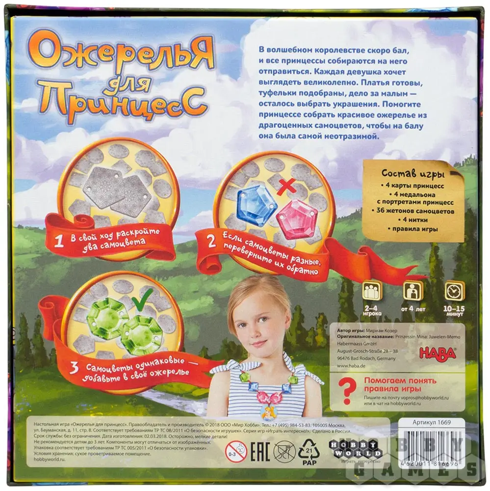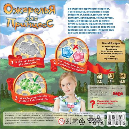 При желании игру можно упростить, убрав жетоны-пустышки с бесполезными камнями. Также наши принцессы могут просто посоревноваться, у кого ожерелье получится самым красивым, и, конечно, примерить его на себя!