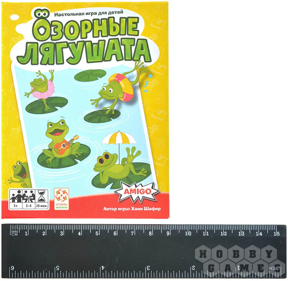 "Озорные лягушата" – это детская карточная игра, которая увлечёт самых юных игроков и поможет родителям обучить их устному счёту. Правила игры очень простые, а партии проходят быстро и увлекательно: В самом начале перед всеми игроками лежат 8 карт в закрытую, то есть рубашкой вверх. В свой ход игроки вытягивают одну карту из общей стопки в центре стола. На карте может быть изображена цифра от 1 до 8, лягушка или мусор. Если вытянули карту с цифрой – поместите её в своё ряд на место, соответствующее цифре на карте. Если вытащили карту с мусором, то ваш ход мгновенно завершается и переходит к следующему игроку. Как только один из игроков выкладывает последнюю карту в свой ряд в открытую, раунд завершается. Все игроки, собравшие ряд по порядку, в следующем раунде составляют ряд на одну карту меньше.