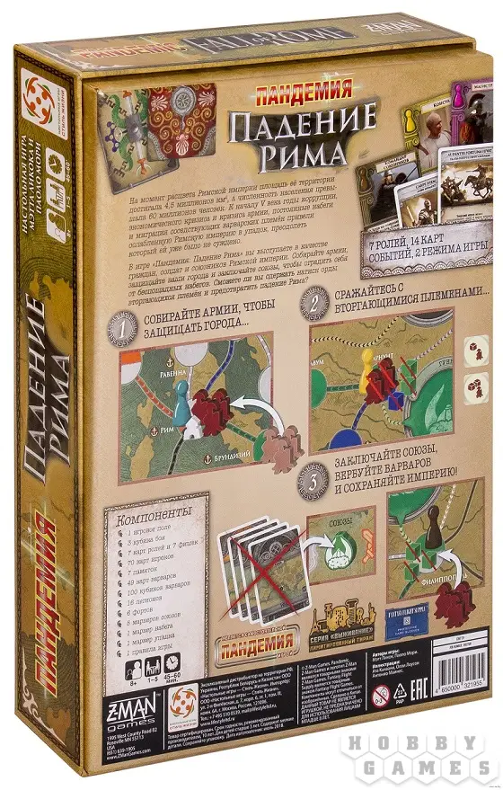 В настольной игре Пандемия. Падение Рима вы выступаете в качестве граждан, солдат и союзников Римской империи. Собирайте армии, защищайте ваши города и заключайте союзы, чтобы оградить себя от беспощадных набегов. Сможете ли вы сдержать натиск орды вторгающихся племён и предотвратить падение Рима?