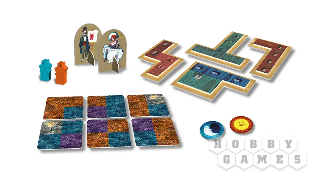 Тайлы мостовой имеют три цвета: оранжевый и синий - для соперников, фиолетовый - общий. Стройте здания только на мостовых своего цвета, но будьте внимательны - противник может расширить свои площади, разместив свои здания на общих мостовых. На первом этапе вам также предстоит добывать здания, которые вы используете во второй половине игры. Каждое здание уникально, так что порой забрать из-под носа соперника такой необходимый жетон – это уже половина победы.