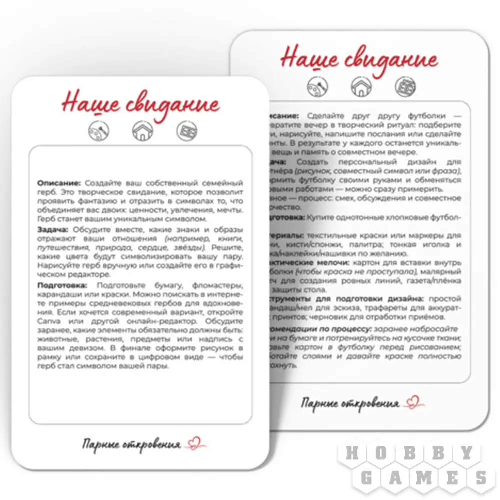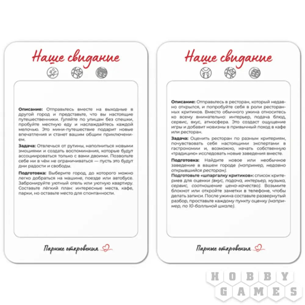 В колоде – 33 готовых идеи для свиданий: от домашнего вечера с настолками и handmade-ужина до прогулок с необычными заданиями и вылазок в незнакомые уголки города. Просто вытяните карту, вдохновитесь и создайте момент, который запомнится надолго.