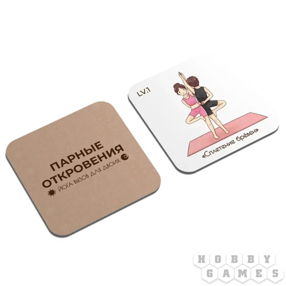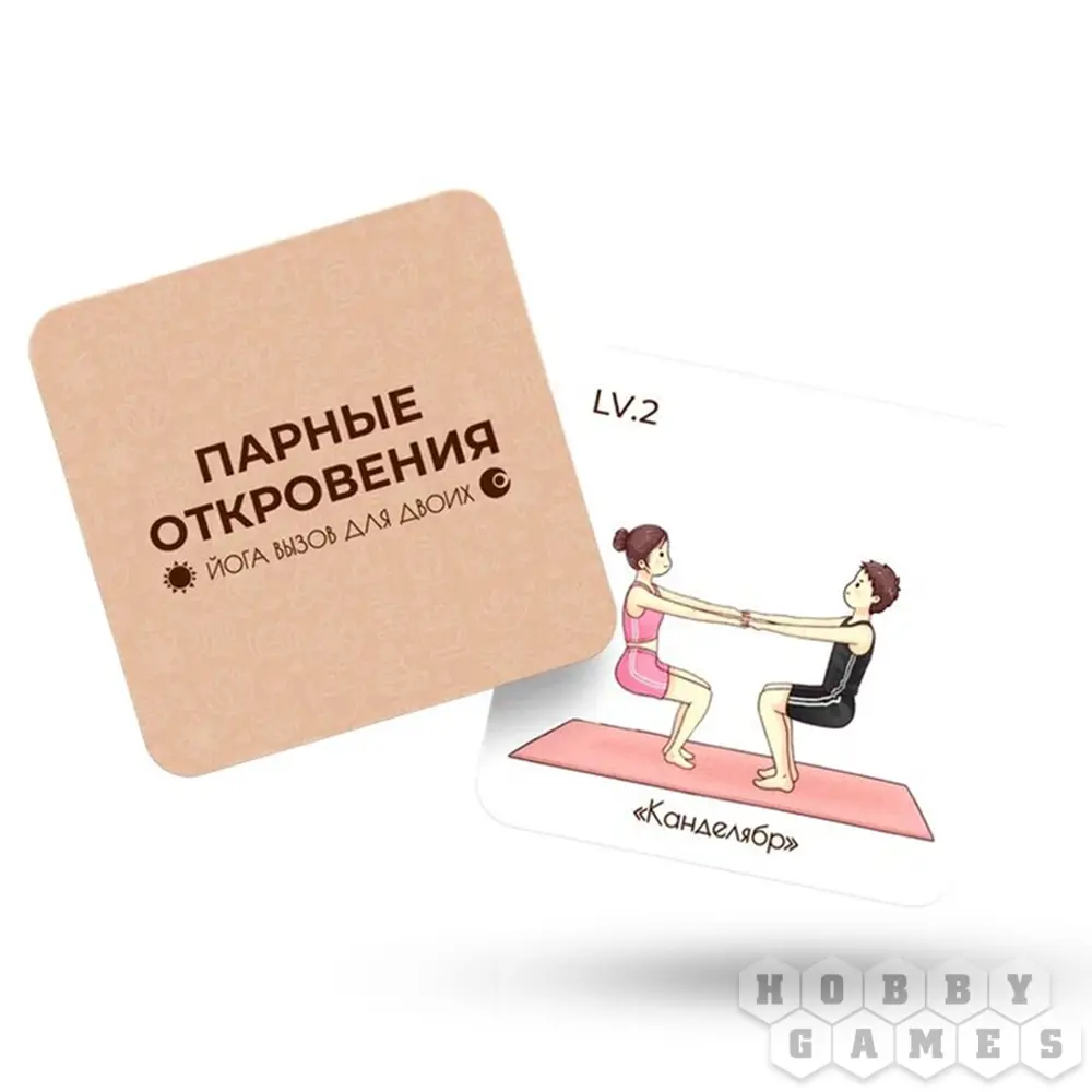 "Парные откровения: Йога для двоих" – идеальный выбор для пар, влюблённых, друзей или подруг. Эта игра включает 50 карточек с разнообразными позами йоги для двоих, которые вы сможете повторить вместе с партнёром. 50 карточек с 50 уровнями, участники по очереди тянут карточку с йога позой и стараются повторить её.