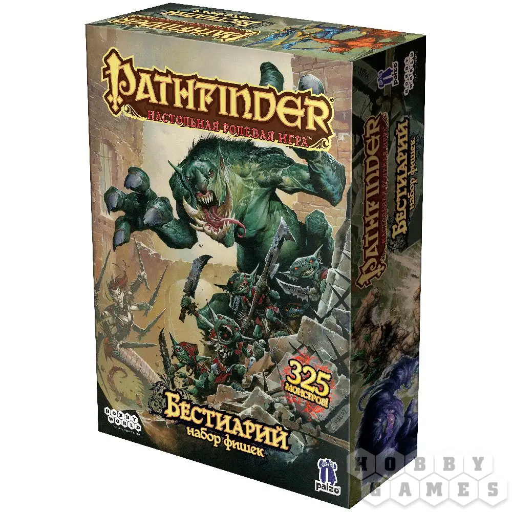 В данной коробке вас ждут несколько сотен, а точнее – 325 картонных фишек с изображением фантастических животных, существ и монстров из мира ролевой игры Pathfinder. Этот набор создан специально, чтобы игроки могли наглядно представлять, кто встречается на пути, как именно выглядят их враги и союзники. В наборе вы также найдёте пластиковые подставки различных размеров, чтобы крепить в них фишки.