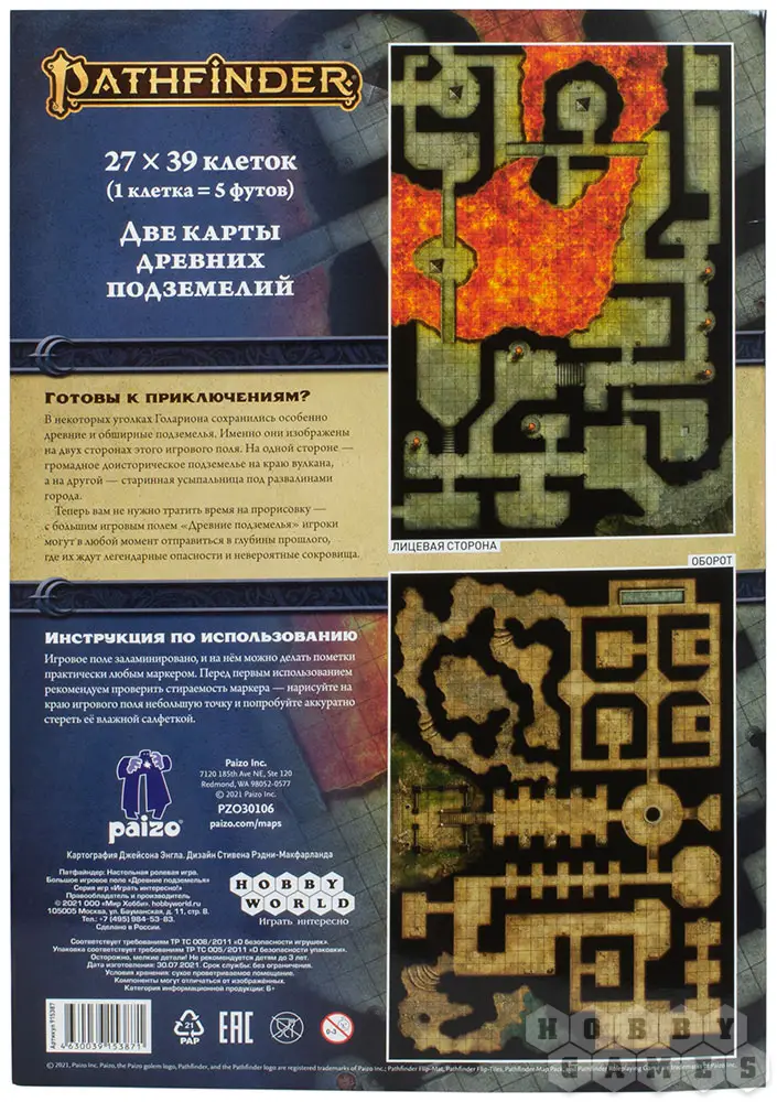 Готовы к приключениям? В некоторых уголках Голариона сохранились особенно древние и обширные подземелья. Именно они изображены на двух сторонах этого игрового поля. На одной стороне – громадное доисторическое подземелье на краю вулкана, а на другой — старинная усыпальница под развалинами города.