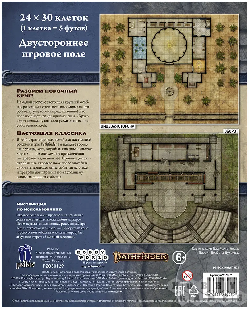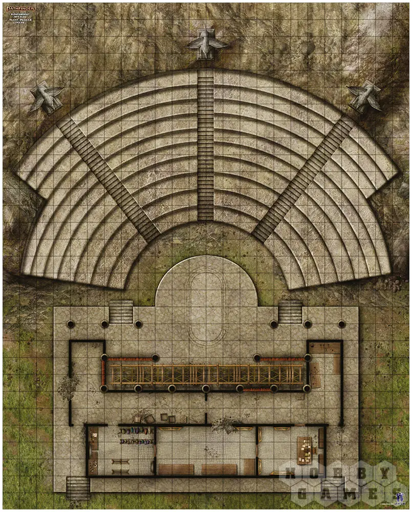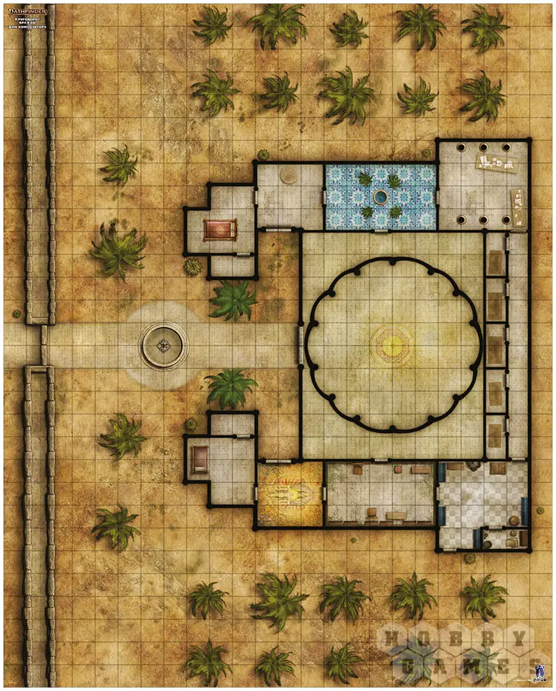 Перед вами карта пустынной Тувии и оживлённого Ламасара, жители которого считали дни до долгожданной постановки. Это игровое поле отлично подойдёт как для приключения "Круговорот вражды", так и для ваших собственных сюжетов.