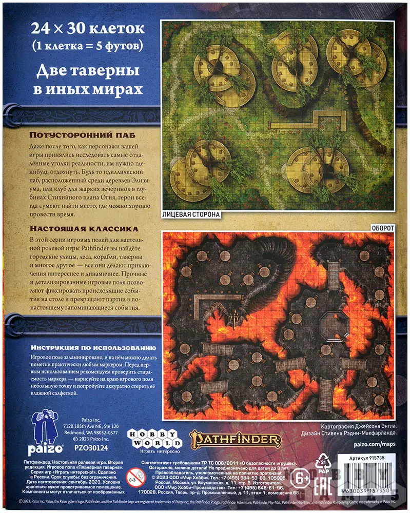 Погрузитесь в динамичные приключения на городских улицах, в лесу, на кораблях, в тавернах и в других атмосферных местах. Карты разбиты на клетки по 5 футов в соответствии с правилами игры. Каждое поле обладает размером 24х30 клеток и заламинировано, а потому вы сможете делать пометки практически любым маркером.