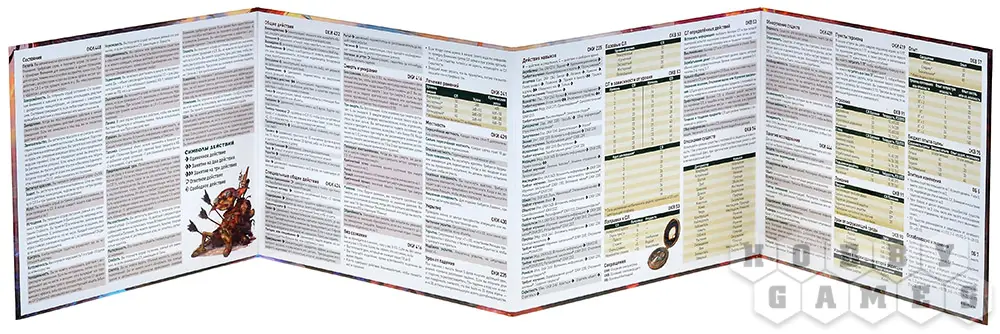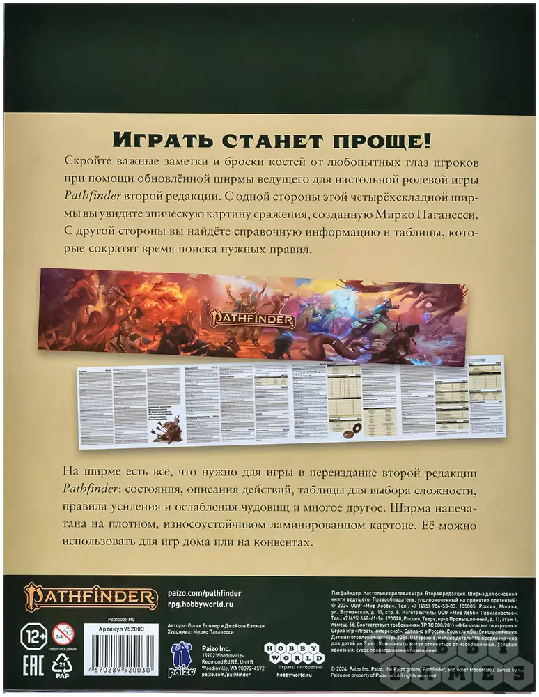 Изнанка ширмы тематически изображает сражение, а автором этой шикарной иллюстрации является Мирко Паганесси. Подобное визуальное сопровождение придаст атмосферы вашей игре и наверняка вдохновит на собственные свершения. Сторона ведущего содержит в себе разнообразные таблицы и данные – о состояниях, действиях и правилах в тех или иных ситуациях. Это абсолютный мастхэв для всех, кто проводит настольные ролевые игры по Pathfinder. А качественное покрытие и износоустойчивый материал гарантируют этой четырёхскладной ширме долговечность.