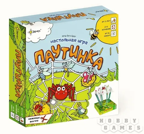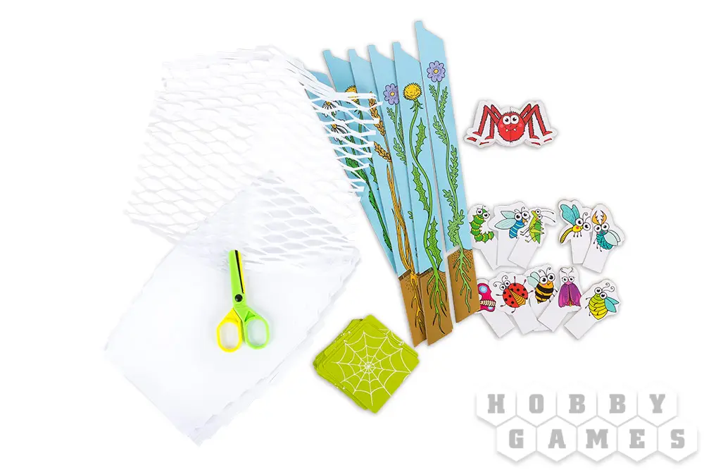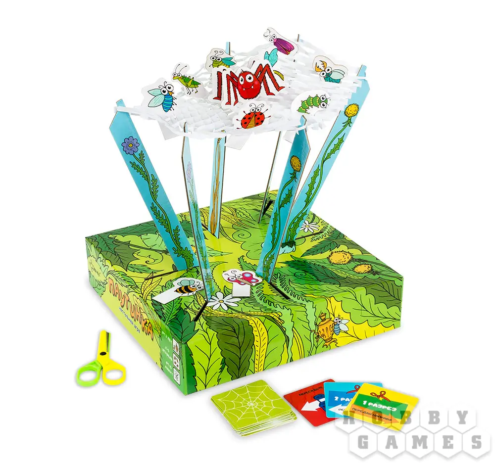Достаньте из коробки паутинки и цветы-опоры, натяните паутинку и разместите на ней паучка и 10 букашек. По очереди делайте разрезы ножницами, чтобы освободить всех жучков. Осторожно, сам паучок должен оставаться на паутинке! Как только все букашки свободны - вы все вместе выигрываете!