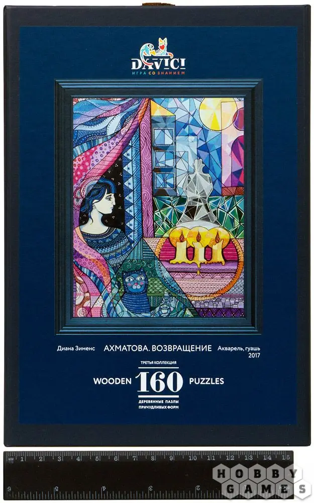 Пазл "Ахматова. Возвращение" основан на картине отечественной художницы из Твери Дианы Зименс, написанной ею в 2017 году. В деталях пазла вам встретятся и юная влюблённая девушка, и одинокая грустная женщина, и сама поэтесса, декламирующая свои стихи со сцены литературно-художественного кабаре "Бродячая собака". Томик поэзии, канделябр, перо и цветы – словно отображение ахматовской поэзии