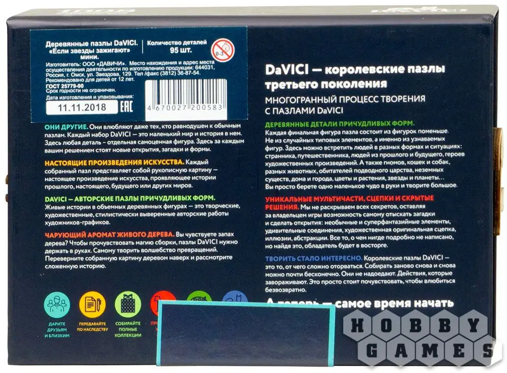 Пазл из мини-коллекции DaVICI, состоящий из 95 деталей. Уровень сложности начальный, среднее время сборки – полтора часа.