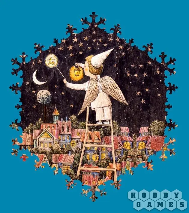 Милый ночной ангелок сосредоточенно занят любимым важным делом – с помощью волшебной палочки зажигает звёзды. Жители городка уже готовятся ко сну, не зная, какое чудо происходит в данный момент над их головами.