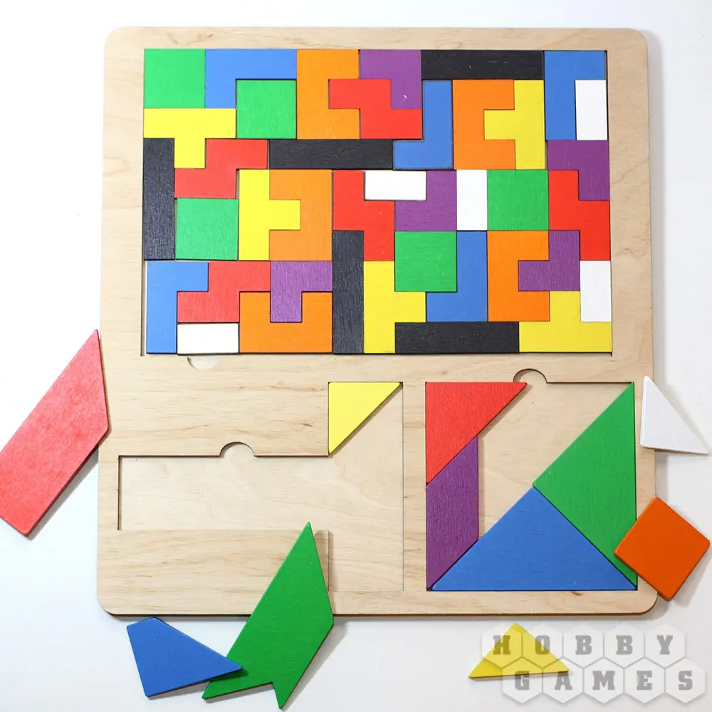 Яркая интересная головоломка "TETRISWOOD" - аналог компьютерной игры Тетрис. Кроме того в комплекте идет танграм и т-танграм. Экологичные деревянные брусочки удобно ложатся на игровое поле, которое имеет бортики, благодаря которым головоломка не разрушится от неловкого движения. Отличный подарок для ребенка. Пазл развивает мышление, мелкую моторику, зрительное восприятие, усидчивость, а также помогает разобраться в понятиях "часть" и "целое" и знакомит с разнообразием цветов и форм.