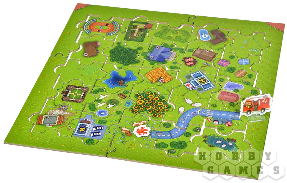Перед началом игры соедините 4 рамки – это границы игрового поля. Затем выберите любую карту головоломки и выложите стартовый пазл, как на ней указано, чтобы составить текущий план города. У вас останется несколько деталей пазла – с их помощью вы и будете решать задачу. На карте головоломки также указано, где на поле располагаются жетоны происшествий и фишка пожарной машины. Расположите их согласно карте. Теперь вы готовы помогать пожарным!