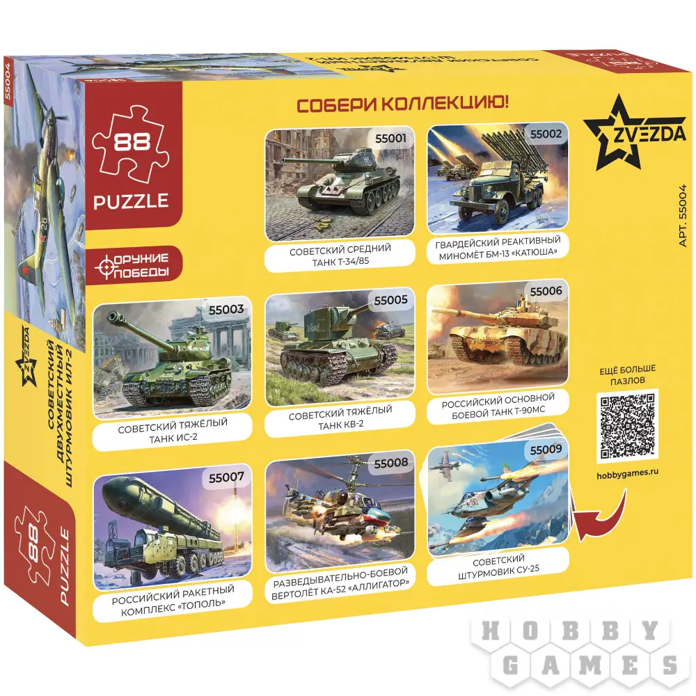 Увлекаетесь сборными моделями? Интересуетесь историей и военной техникой? А может, вас просто увлекает методическое собирание мелких деталей в единую картинку? Если хотя бы один из пунктов попал в точку, вам наверняка придутся по вкусу пазлы от Zvezda! Благодаря им вы отправитесь в увлекательное путешествие сквозь время. Легендарные танки, знаменитые истребители, скоростные штурмовики – теперь к каждой уже имеющейся в вашей коллекции сборной модели вы сможете добавить тематический пазл! А профессиональные иллюстрации Андрея Жирнова помогут создать исторически достоверную атмосферу – ведь каждый элемент, каждая линия этой головоломки пропитаны духом эпохи. Вы будете не просто соединять детали – вам предстоит изучать инженерные решения прошлого, тренировать внимательность и получать ни с чем не сравнимое удовольствие от создания картины своими руками.