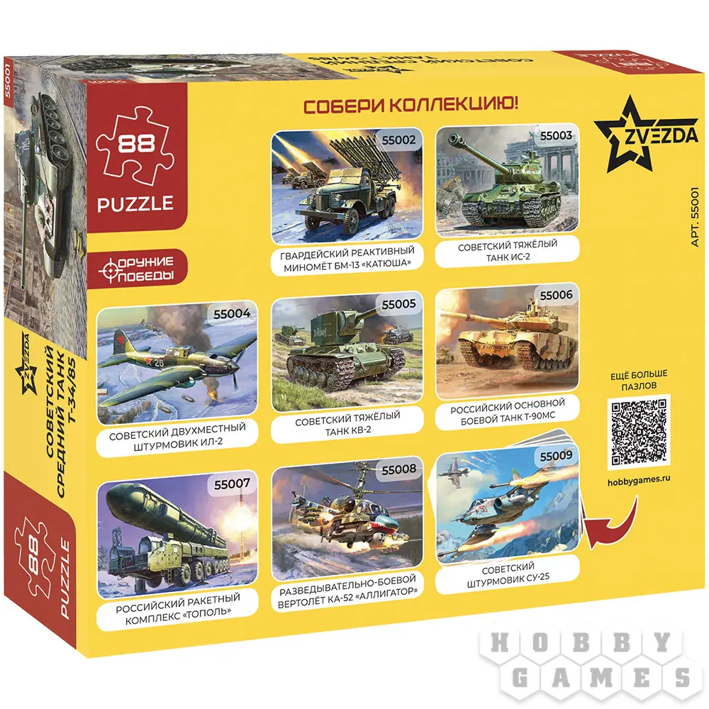 Увлекаетесь сборными моделями? Интересуетесь историей и военной техникой? А может, вас просто увлекает методическое собирание мелких деталей в единую картинку? Если хотя бы один из пунктов попал в точку, вам наверняка придутся по вкусу пазлы от Zvezda! Благодаря им вы отправитесь в увлекательное путешествие сквозь время. Легендарные танки, знаменитые истребители, скоростные штурмовики – теперь к каждой уже имеющейся в вашей коллекции сборной модели вы сможете добавить тематический пазл! А профессиональные иллюстрации Андрея Жирнова помогут создать исторически достоверную атмосферу – ведь каждый элемент, каждая линия этой головоломки пропитаны духом эпохи. Вы будете не просто соединять детали – вам предстоит изучать инженерные решения прошлого, тренировать внимательность и получать ни с чем не сравнимое удовольствие от создания картины своими руками.