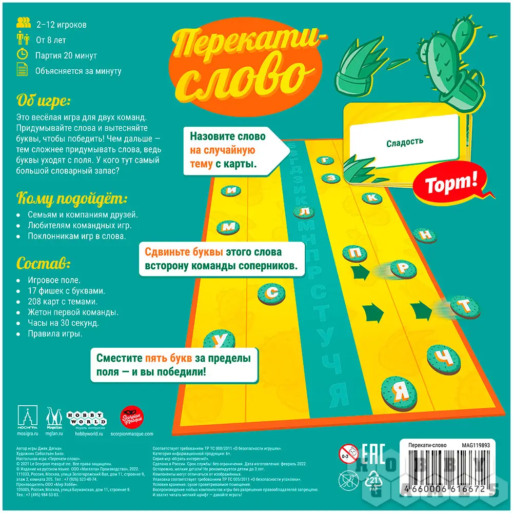 "Перекати-слово" – это словесная вечериночная игра, рассчитанная на две команды игроков. В ней не нужно объяснять слова – их нужно подбирать самостоятельно таким образом, чтобы они включали как можно больше букв, находящихся на поле. Ведь когда вы назовёте слово, его буквы сдвинутся на поле в сторону команды противников – а когда пять букв будут вытеснены за его пределы, вы выиграете! Звучит совершенно несложно, но слово должно соответствовать условию с карточки – например, надо будет назвать какую-то сладость или пятнистое животное. Проверьте свой вокабуляр!