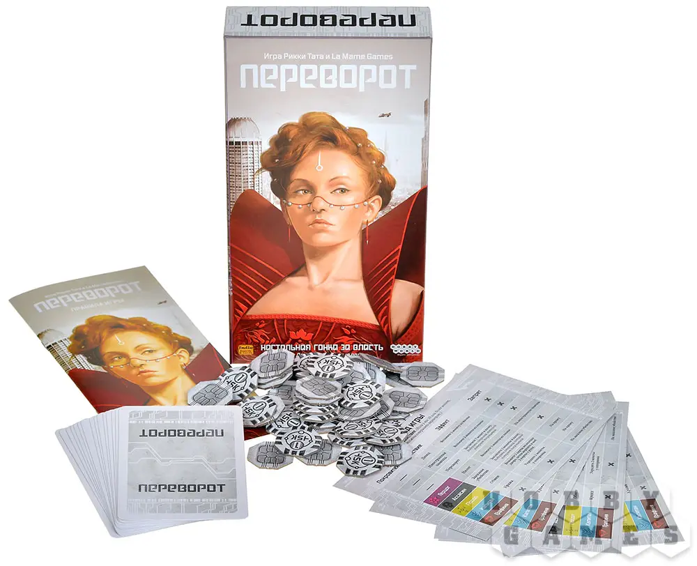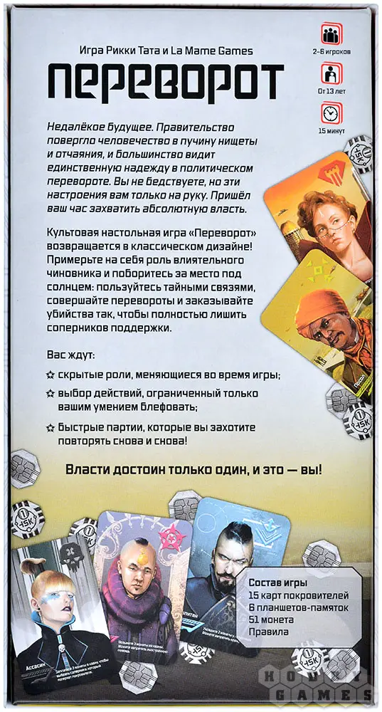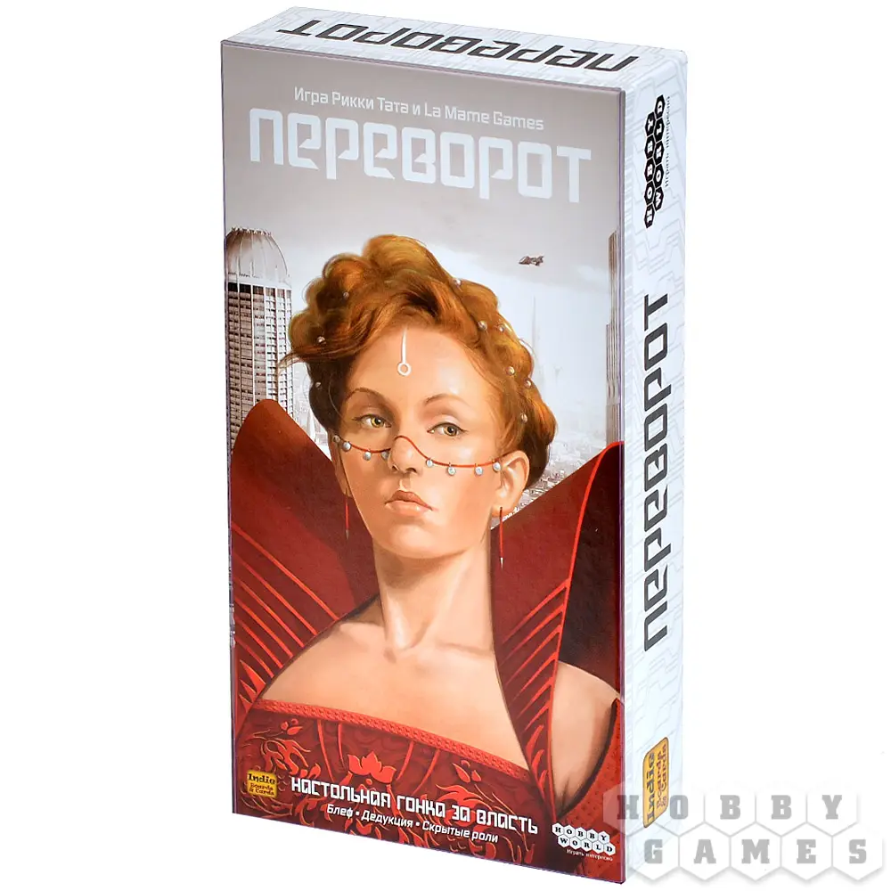 "Переворот" – это культовая карточная игра, в которой вы примерите на себя роль одного из персонажей, обладающих уникальными способностями и сражающихся за место под солнцем – то есть за единоличную власть в ныне преступном городе. Используйте всё, что припрятано у вас в рукаве: плетите интриги, устраняйте соперников самыми радикальными способами, заводите и нарушайте союзы и договоры. Накапливайте капитал, наращивайте своё влияние и не забывайте держать лицо, ведь только с помощью блефа вам удастся – быть может – обмануть всех остальных, кто покушается на ваше законное право власти.
