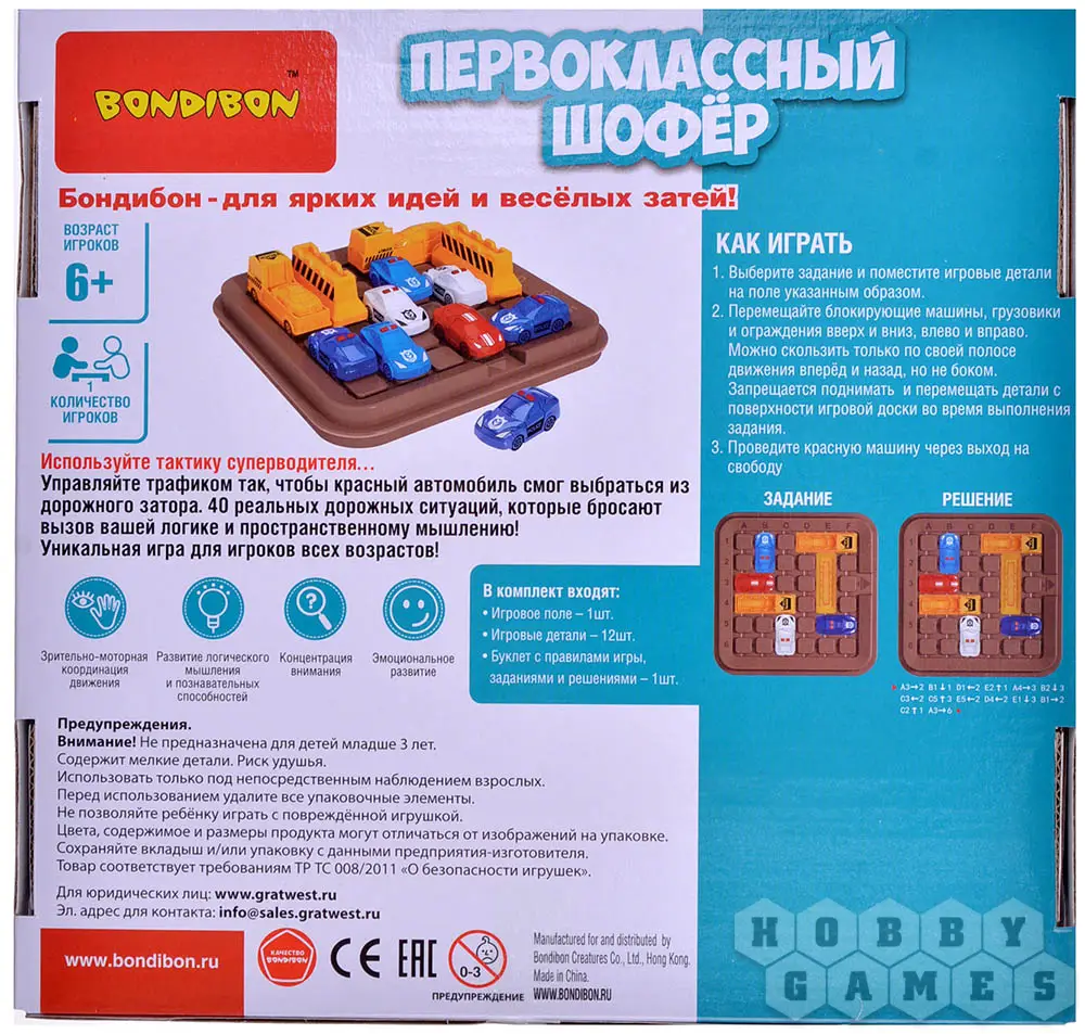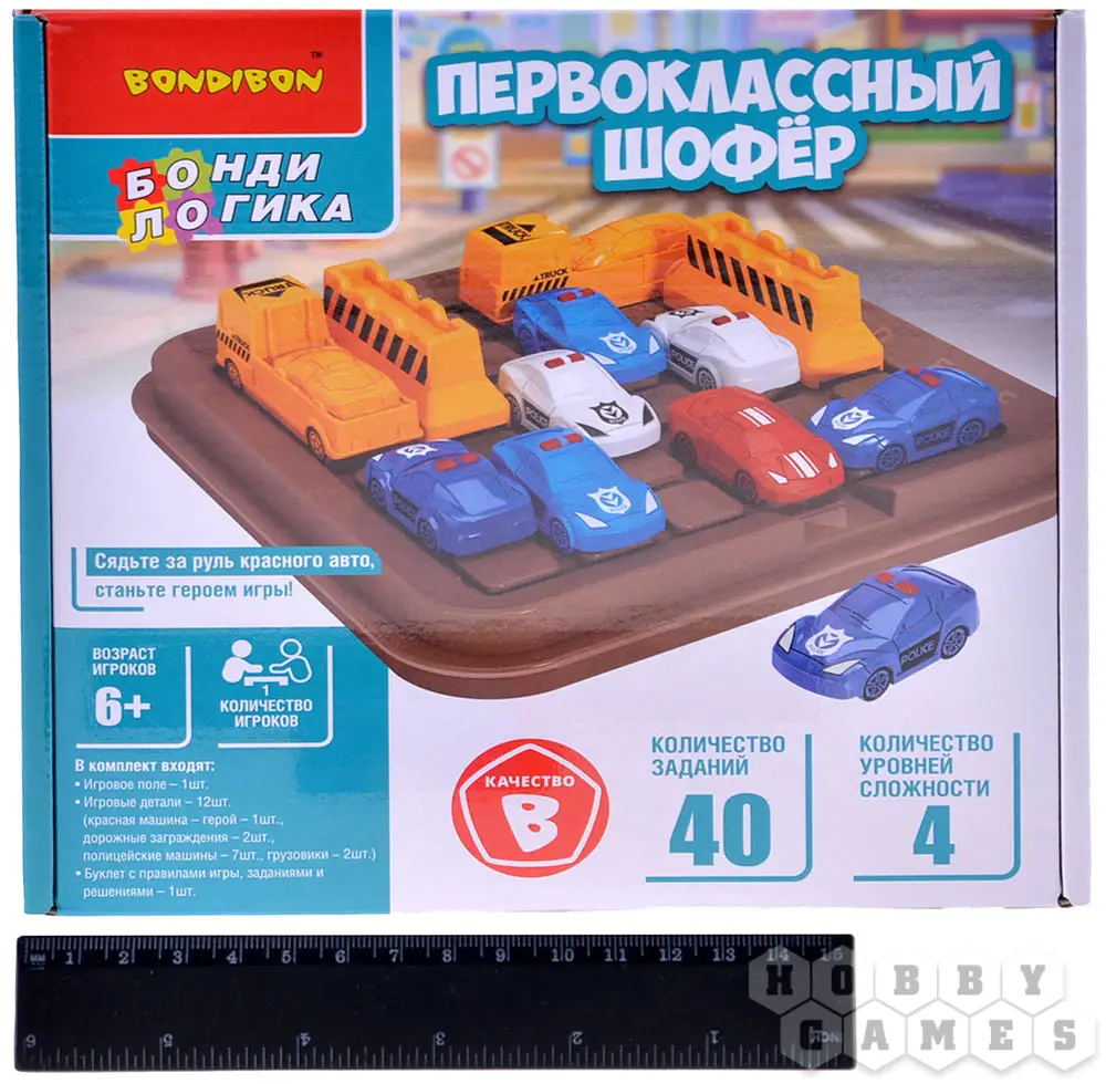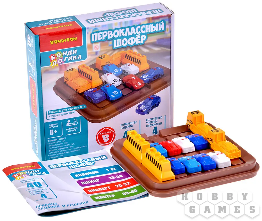 Станьте первоклассным шофёром в одноимённой настольной игре-головоломке от компании "Бондибон"! Чтобы красная машина смогла добраться до пункта назначения, нужно расчистить ей путь: двигайте другие автомобили по игровому полю, чтобы образовать свободный коридор. В игре 40 уникальных заданий от простых до сложных. Тренируйте логическое и пространственное мышление играя!