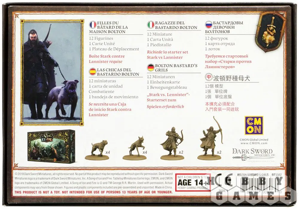 "Бастардовы девочки Болтонов" – это боевой отряд для игры "Песнь льда и огня", который является нейтральным и может быть взят, как часть армии другого дома или полноценного наёмного войска. Их броня легка, что окупается возможностью пострелять из луков и провести нападение за одну активацию. Точное попадание стрелой имеет возможность лишить противника защитных качеств, наложив эффект "Уязвимость". Работа с собаками требует большой выдержки, и поэтому отряд "Бастардовых девочек Болтонов" обладает высоким боевым духом.