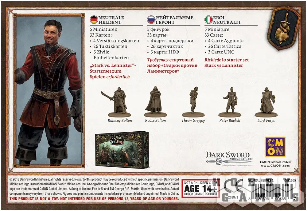 "Песнь льда и огня" предложит Вам роль полководцев для Великих Домов Вестероса. Вам предстоит направлять в бой пехоту и кавалерию, а возглавят Ваши армии герои саги! Ваш стол станет эпицентром сражения сотни великолепных пластиковых миниатюр. Впрочем, победы в битвах недостаточно для того, чтобы выиграть войну. Политическая арена зачастую важнее поля боя...