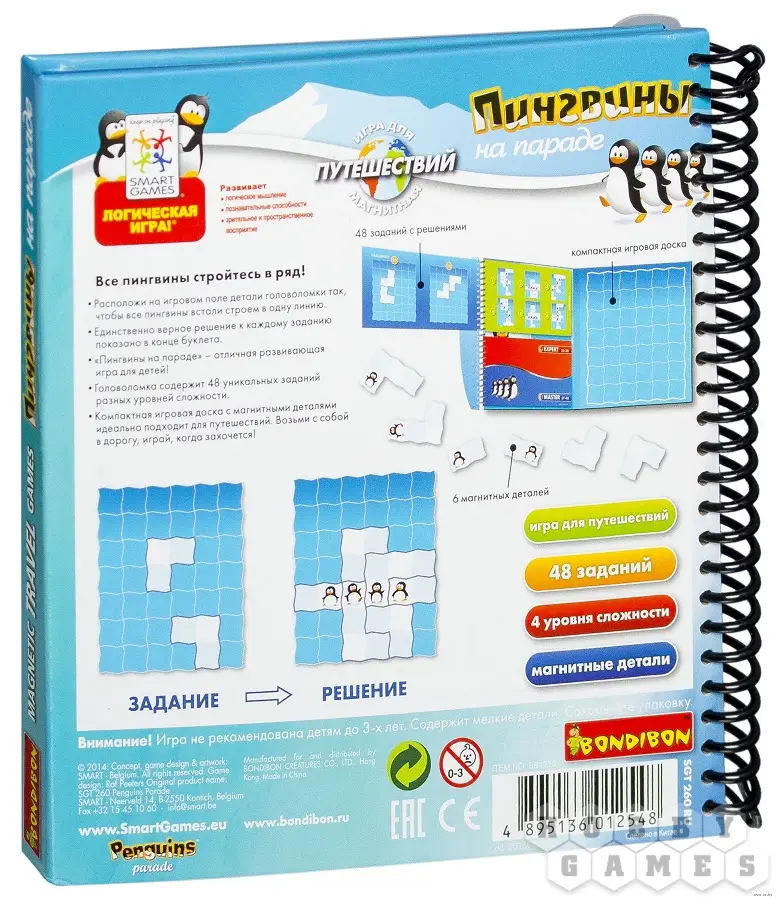 Эта игра предназначена для путешествий, она очень компактна, а магнитные детали пазла замечательно удерживаются на игровом поле. Играй тогда, когда захочется! Игра рассчитана на одного игрока. В состав игры входят шесть магнитных деталей-пингвинов и игровое поле с красочным буклетом.
