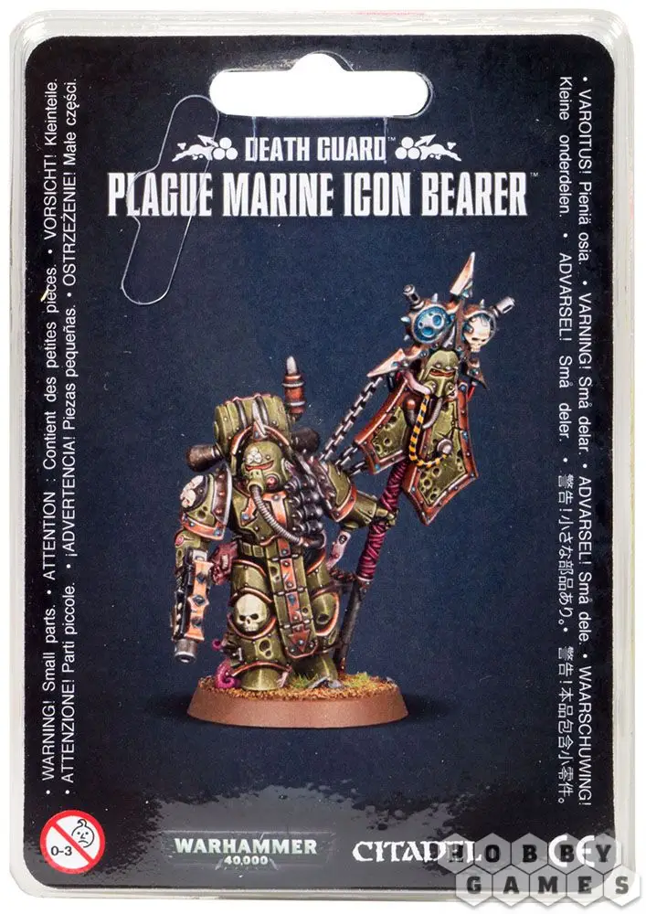В этом наборе вы найдёте все необходимые пластмассовые детали, чтобы собрать Икононосца Чумных Десантников (Plague Marine Icon Bearer). Экипированный болтером (boltgun) и чумным ножом (plague knife), примотанным к ранцу сзади, он идёт в бой с Иконой Отчаяния, представляющей символ Нургла (некоторые его элементы имеют инкрустацию из черепа и шлема). Подвергшаяся разложению, его броня усеяна трещинами и признаками ржавчины, а устрашающие щупальца торчат из брешей правой ноги. На переднем доспехе висит связка из 4 гранат, а на поясе привязана разлагающаяся отрубленная голова.