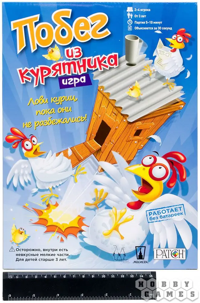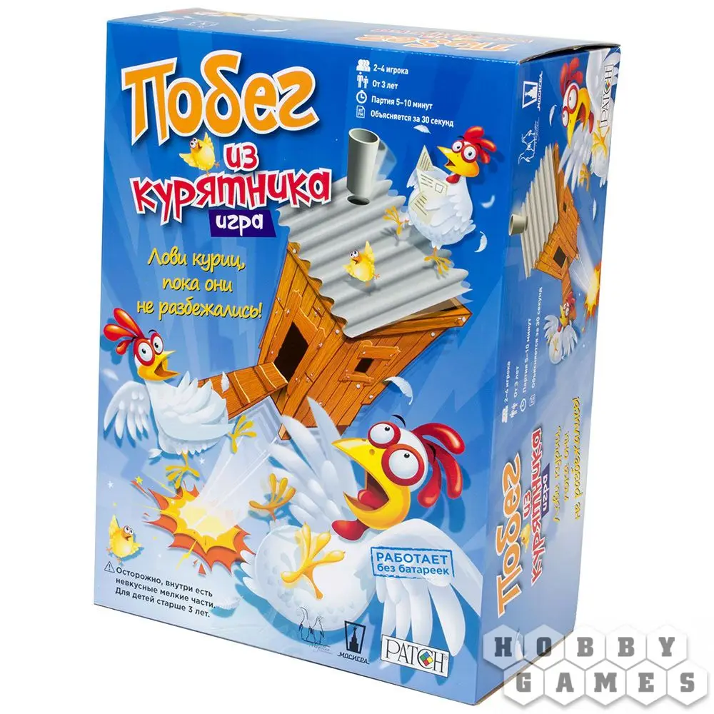 Ловите курочек, а то они разбегутся в разные стороны! "Побег из курятника" – это безумная настольная игра, в процессе которой вам нужно избавиться от всех ваших куриц, пока они не сбежали. Невероятный прыгающий куриный домик станет эпицентром веселья, а тридцать шесть куриц будут из него убегать.