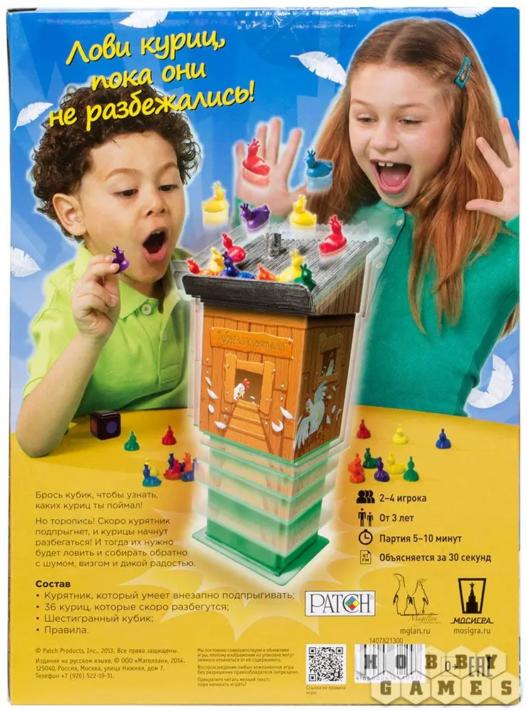 Раздайте всем одинаковое количество случайных куриц, и кидайте кубик, куриц выпавшего цвета можно сбросить в курятник. Нюанс в том, что курятник периодически подпрыгивает и игрок с кубиком должен собрать всех разбежавшихся куриц, взяв себе трёх из них. Передавайте и кидайте кубик, включайте курятник и так до победного, пока один из игроков не сбросит всех своих куриц, и до взрыва курятника не передаст кубик другому.