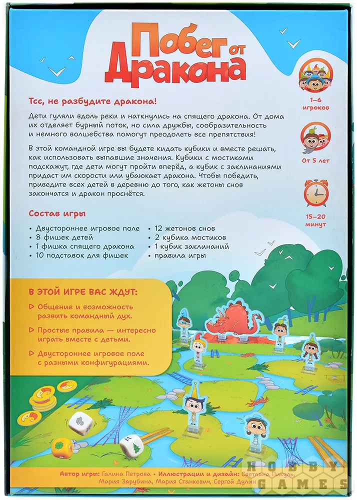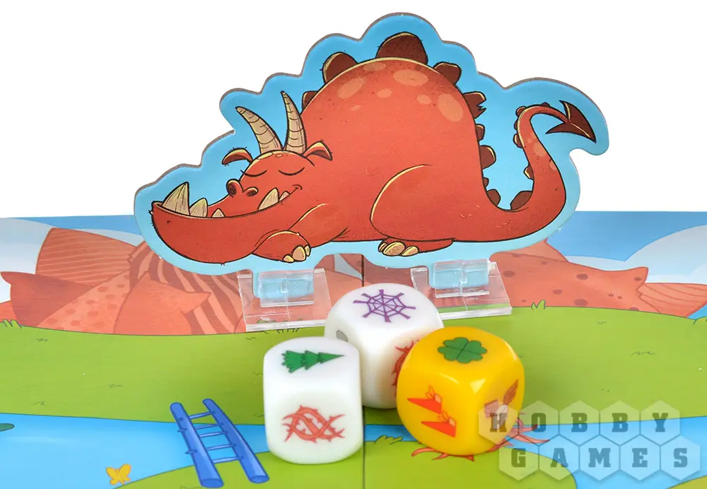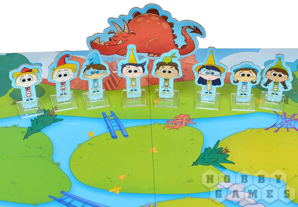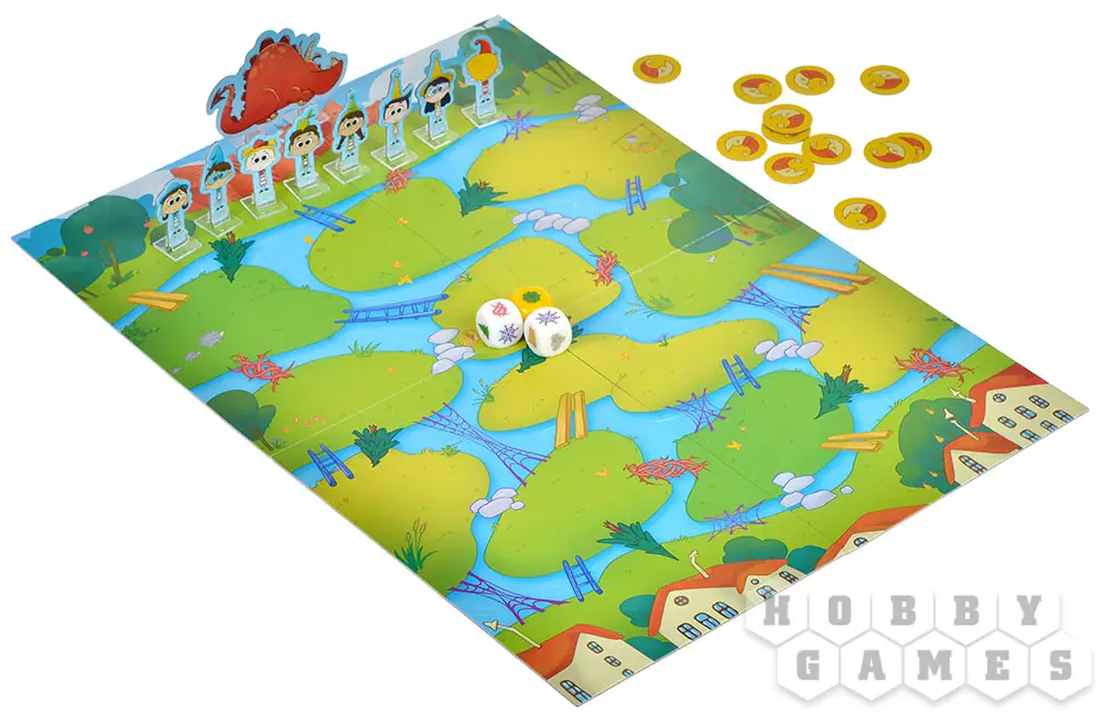 Детей от деревни отделяет река с островками. А чтобы перейти с островка на островок, им нужно использовать мостики. Каждый ход бросайте 3 кубика: два из них покажут, по каким мостикам можно вести детей, а третий откроет возможность использовать заклинание. Совместные решения с командой – залог успеха! Если за ход хотя бы одному маленькому путешественнику удалось добраться до деревни, то дракон продолжает видеть свой сон. В обратном случае вам придется сбросить жетон сна. И помните, когда жетоны закончатся, дракон проснётся, и все ваши усилия пойдут прахом...