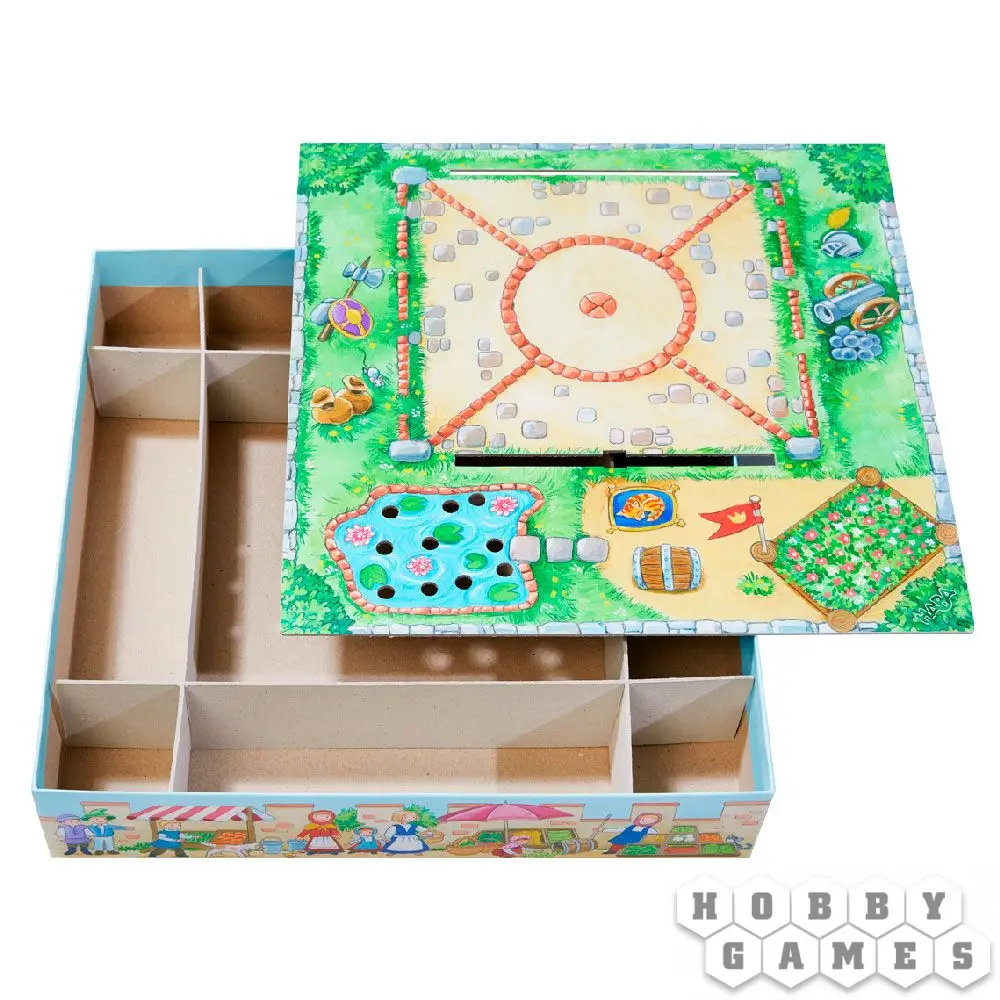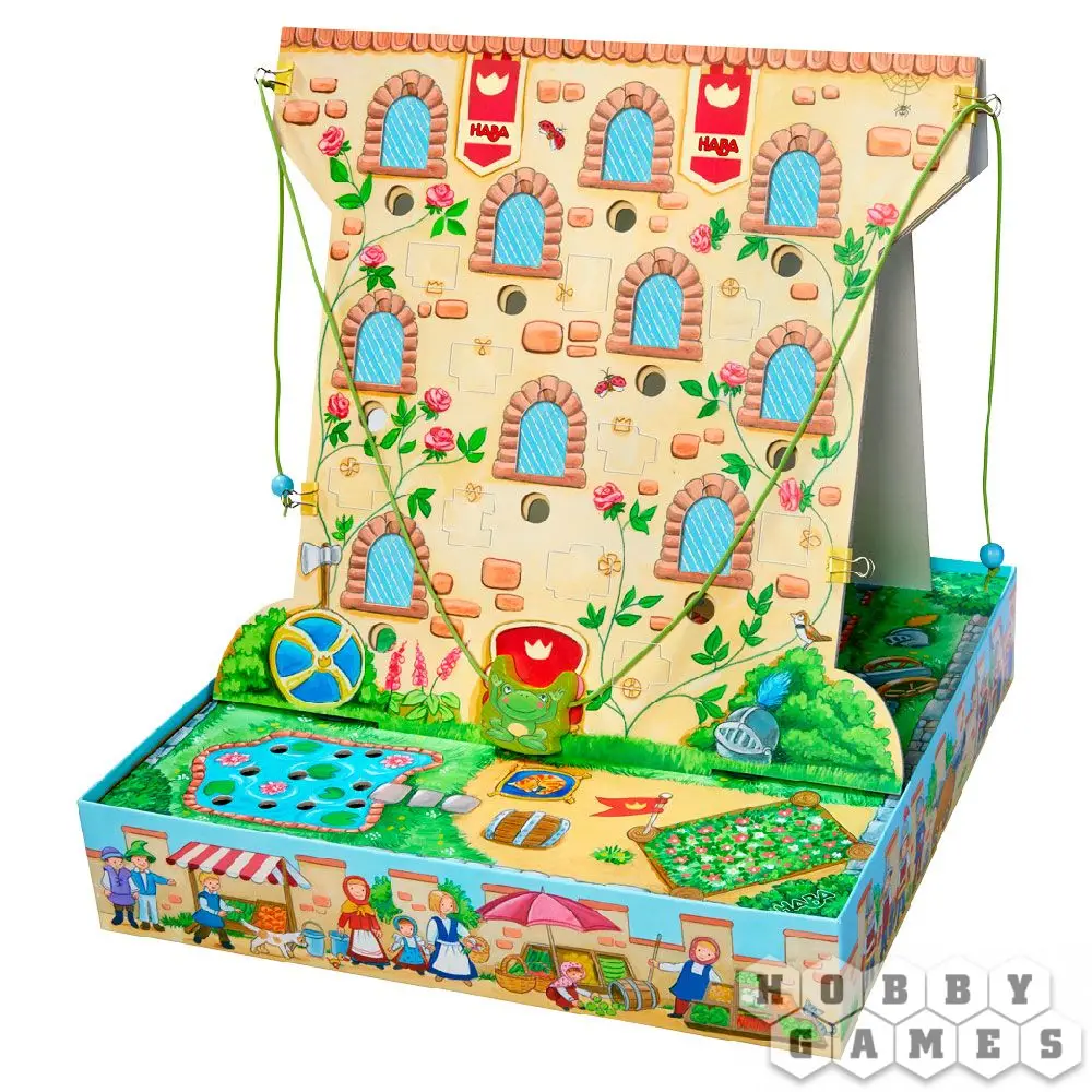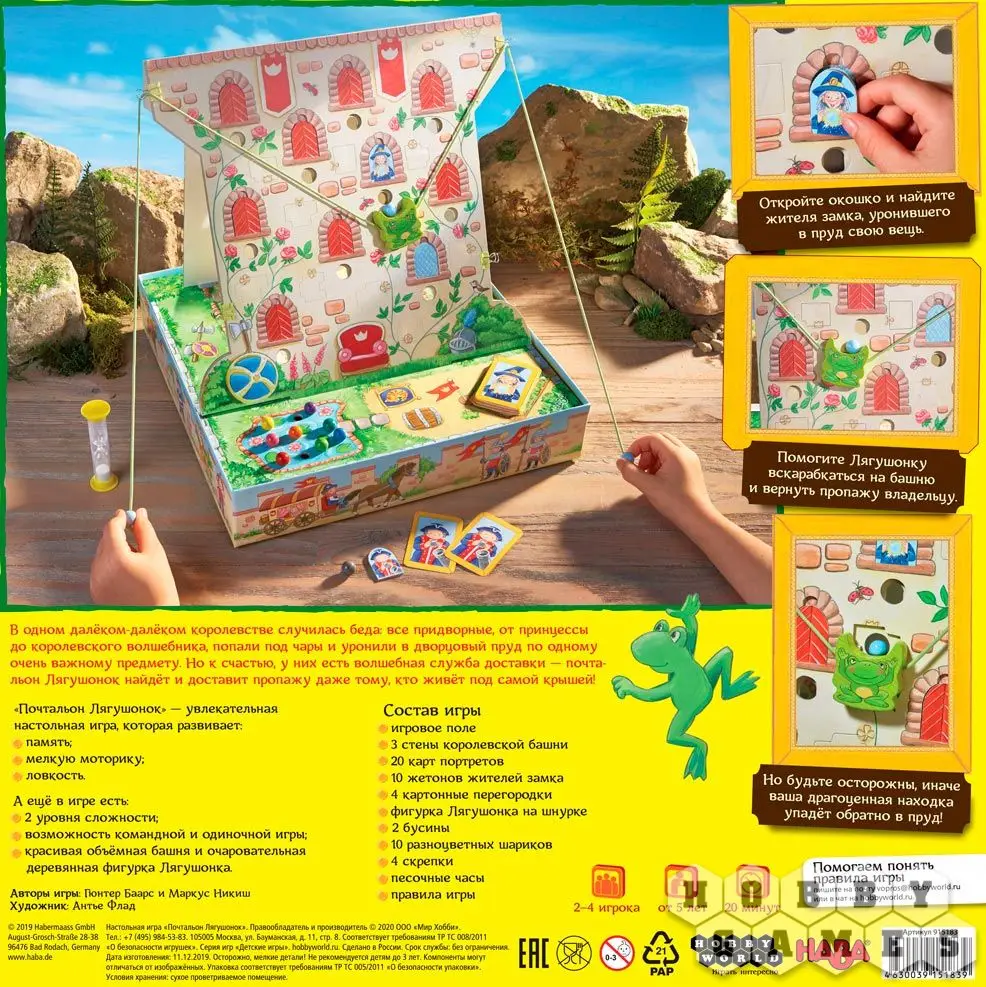"Почтальон Лягушонок" – увлекательная детская игра, способствующая развитию ловкости, памяти и мелкой моторики рук. Просто откройте окошко и найдите жителя замка, уронившего в пруд свою вещь. Затем отыщите эту вещь и помогите Лягушонку вскарабкаться на башню и вернуть пропажу владельцу. Но будьте осторожны, иначе ваша драгоценная находка упадёт обратно в пруд! Игра предусматривает 2 уровня сложности, а также командный режим для нескольких игроков. Внутри коробки объёмное игровое поле с башней и деревянная фигурка лягушонка.