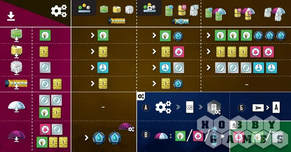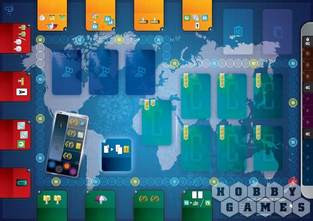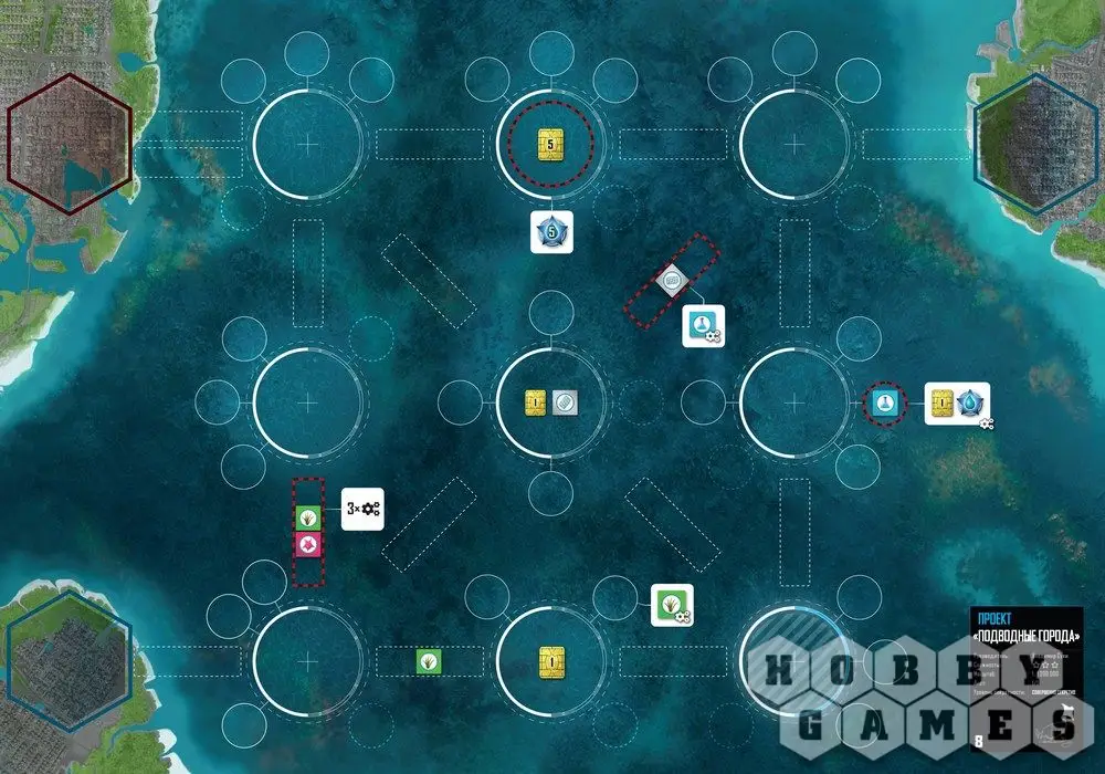 С течением игры время не стоит на месте, и игроки переходят из одной эпохи в другую, предоставляя игрокам новые возможности. По ходу игры вы наращиваете экономику и можете зарабатывать различные ресурсы: сталепласт, биоволокно, водоросли, кредиты, жетоны науки и победные очки. Основная задача игры заключается в строительстве, так что ресурсы вам понадобятся. Помимо различных зданий, строить можно два типа городов, которые имеют важное отличие – симбиотические дороже сами по себе, зато приносят победные очки в процессе игры. Строить города можно на соседних клетках планшета, однако, пока вы не соедините города в сеть с помощью туннеля, город приносить очки не будет.