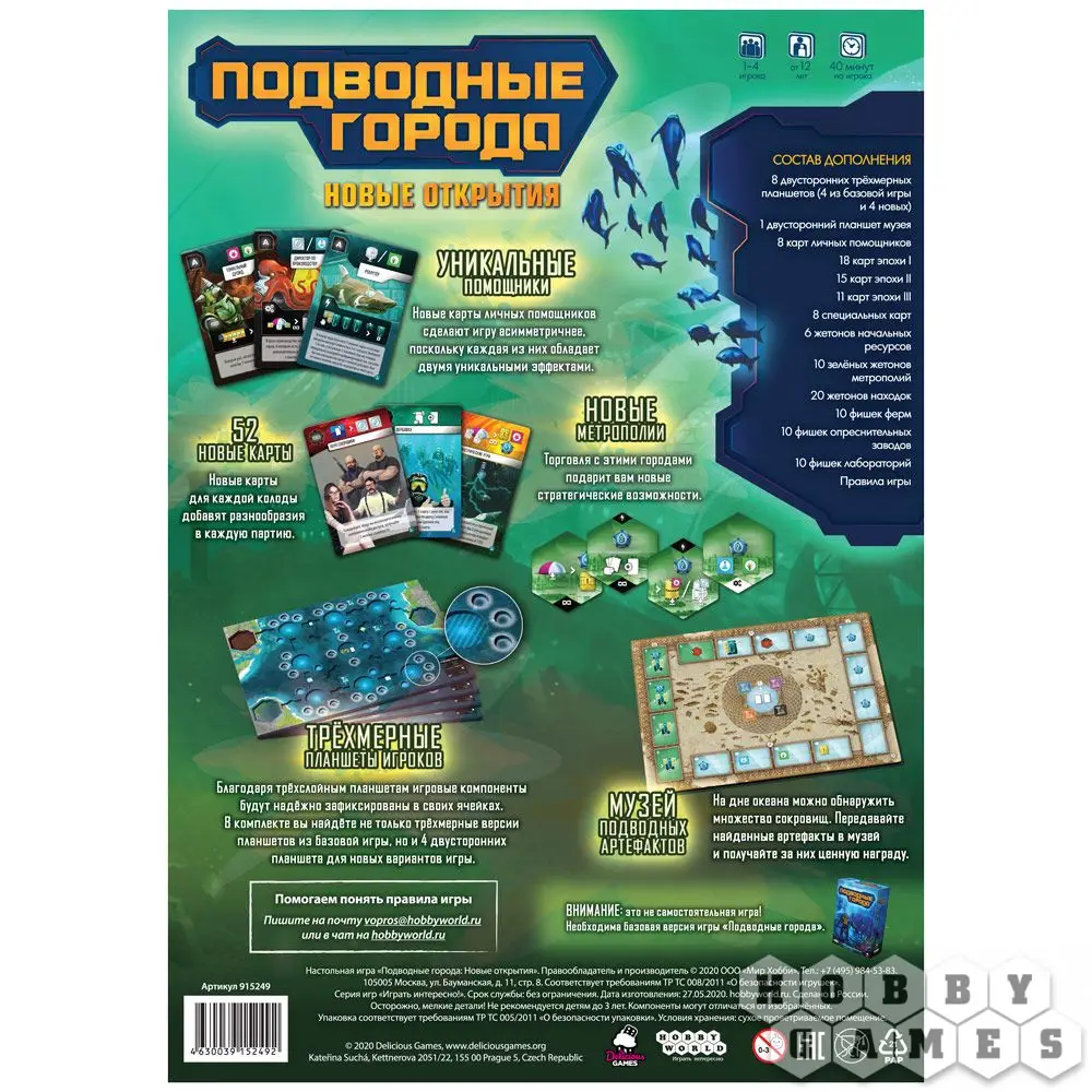 А ещё здесь есть планшеты игроков, которые используются в новых вариантах игры. В состав дополнения входят и трёхмерные версии уже знакомых планшетов из базовой версии. Зелёные метрополии добавят новые стратегические возможности. Также теперь вы сможете взаимодействовать с международным подводным музеем, ведь на дне океана скрыто множество удивительных находок. И пусть человечество по достоинству оценит вклад вашей нации в сохранение всемирного культурного наследия!